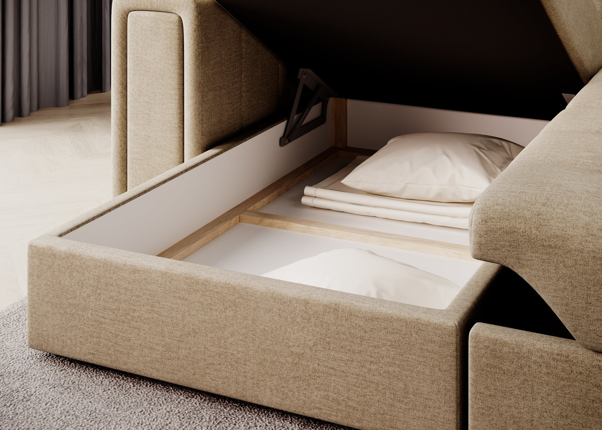 - Úložný prostor: Sedací souprava BLENVI je vybavena praktickým úložným prostorem, který je ideální pro uschování přikrývek, polštářů nebo dalších nezbytností, které chcete mít po ruce, ale zároveň je mít úhledně uklizené.