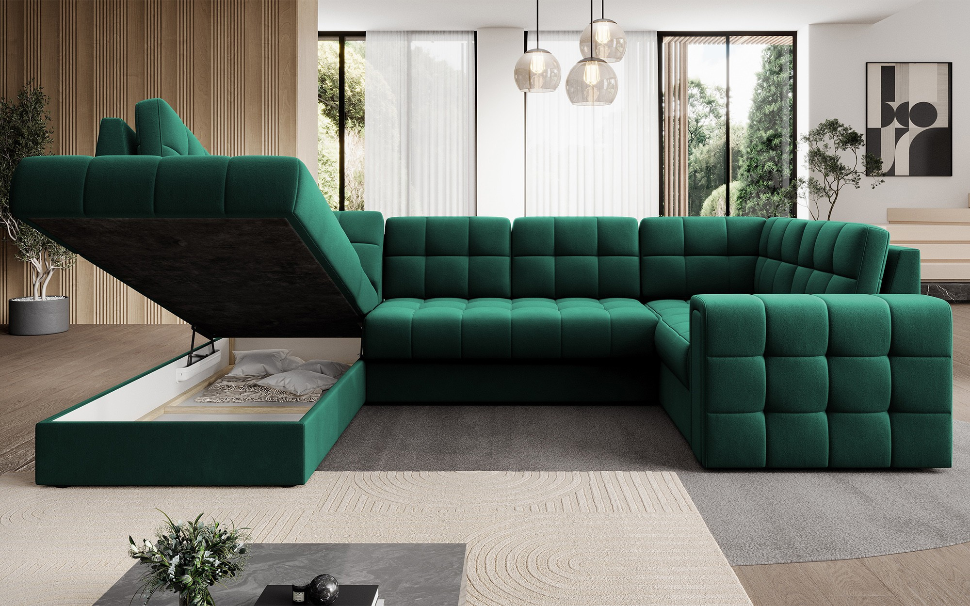 Moderní rohová rozkládací pohovka Blewett 299x198x82 cm je ideální volbou pro ty, kteří hledají elegantní a pohodlnou rohovou pohovku do svého obývacího pokoje.Rohová pohovka Blewett vyniká pohodlným sedákem vyrobeným z vlnových pružin typu B a polyuretanových pěn T2540 a T2130, což zajišťuje dlouhotrvající pohodlí a odolnost.Opěradlo je vyplněno pěnovou výplní, která se dokonale přizpůsobí tvaru zad, čímž zvyšuje komfort relaxace.Rohová sedací souprava Blewett v obývacím pokoji je vybavena spací funkcí typu Dolphin, která umožňuje rychlé rozložení, a praktickým úložným prostorem na lůžkoviny—ideální pro skladování.Tato moderní rohová pohovka Blewett má čalouněné opěradlo, díky čemuž vypadá skvěle v jakékoli části místnosti.Robustní černé plastové nohy zdůrazňují moderní styl pohovky.Vysoce kvalitní řemeslné zpracování, funkčnost a módní design činí z Blewettu vynikající rozkládací pohovku, která splňuje očekávání i těch nejnáročnějších uživatelů.