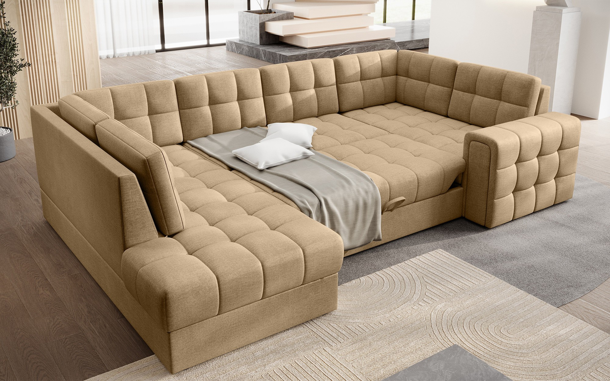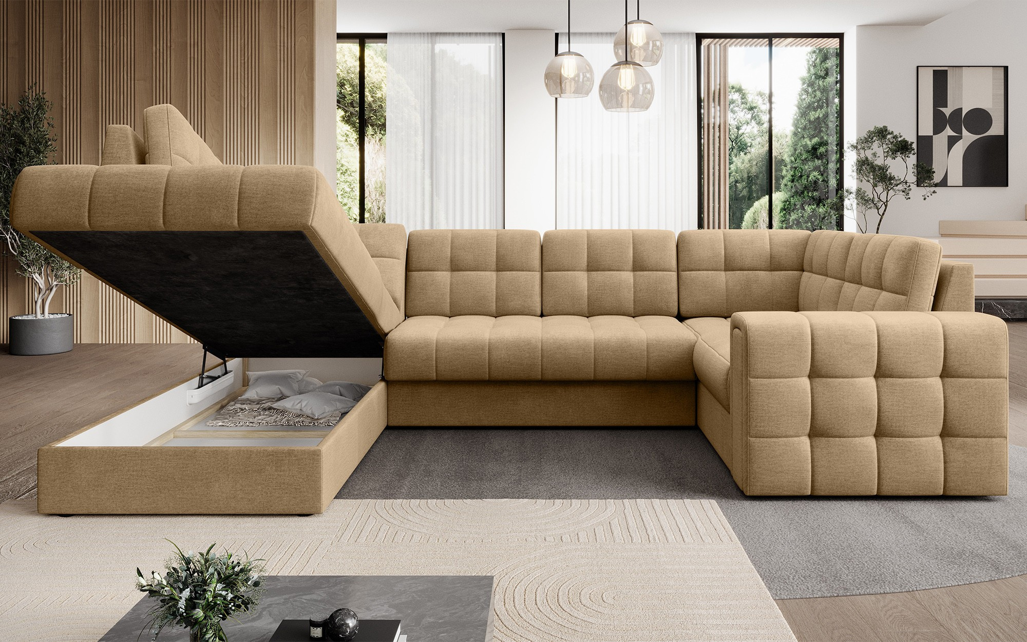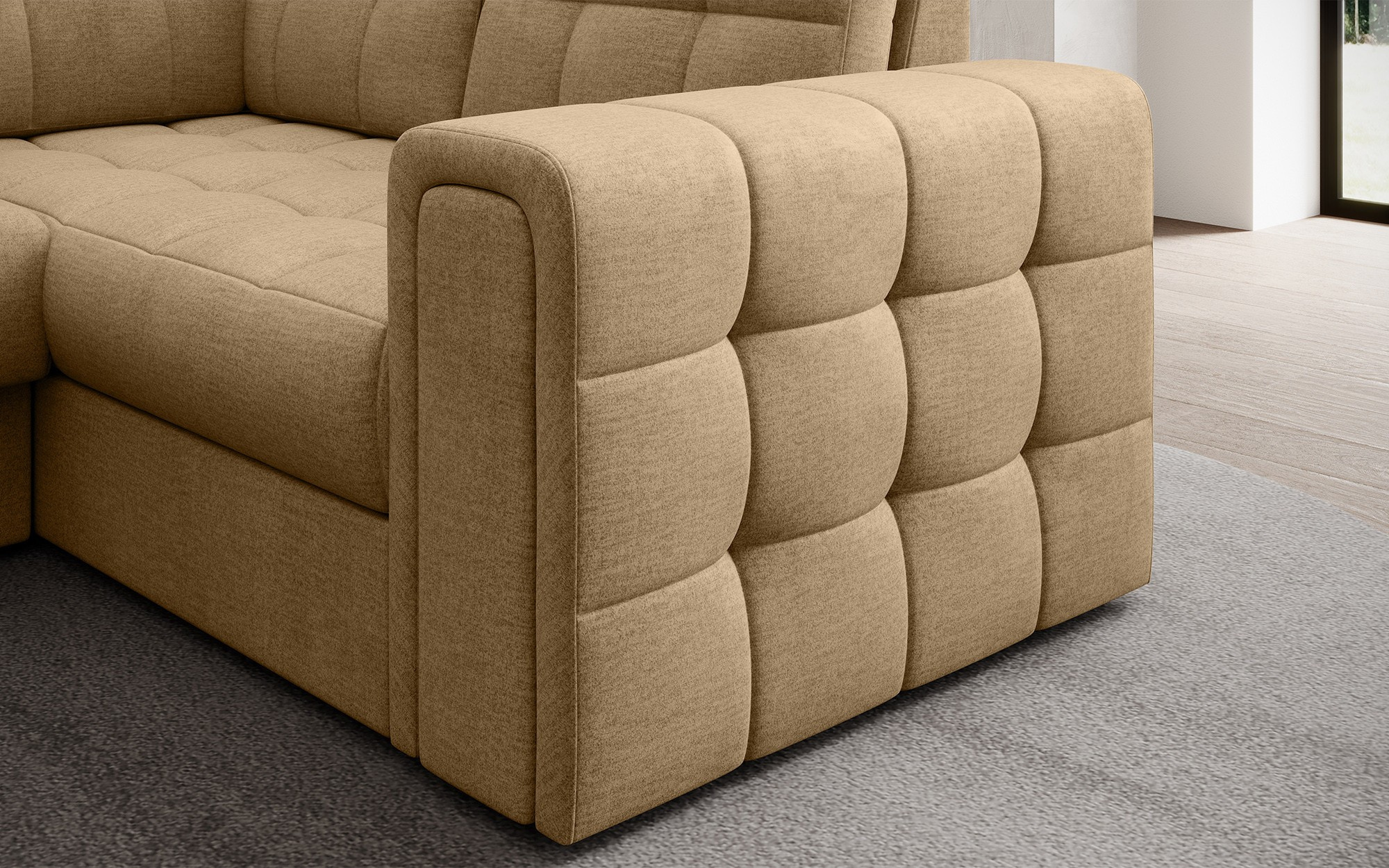 Moderní rohová rozkládací pohovka Blewett 299x198x82 cm je ideální volbou pro ty, kteří hledají elegantní a pohodlnou rohovou pohovku do svého obývacího pokoje.Rohová pohovka Blewett vyniká pohodlným sedákem vyrobeným z vlnových pružin typu B a polyuretanových pěn T2540 a T2130, což zajišťuje dlouhotrvající pohodlí a odolnost.Opěradlo je vyplněno pěnovou výplní, která se dokonale přizpůsobí tvaru zad, čímž zvyšuje komfort relaxace.Rohová sedací souprava Blewett v obývacím pokoji je vybavena spací funkcí typu Dolphin, která umožňuje rychlé rozložení, a praktickým úložným prostorem na lůžkoviny—ideální pro skladování.Tato moderní rohová pohovka Blewett má čalouněné opěradlo, díky čemuž vypadá skvěle v jakékoli části místnosti.Robustní černé plastové nohy zdůrazňují moderní styl pohovky.Vysoce kvalitní řemeslné zpracování, funkčnost a módní design činí z Blewettu vynikající rozkládací pohovku, která splňuje očekávání i těch nejnáročnějších uživatelů.