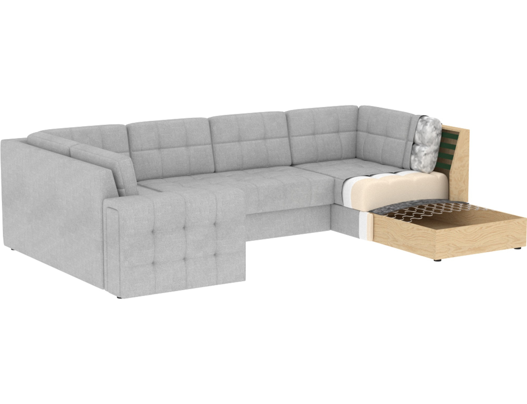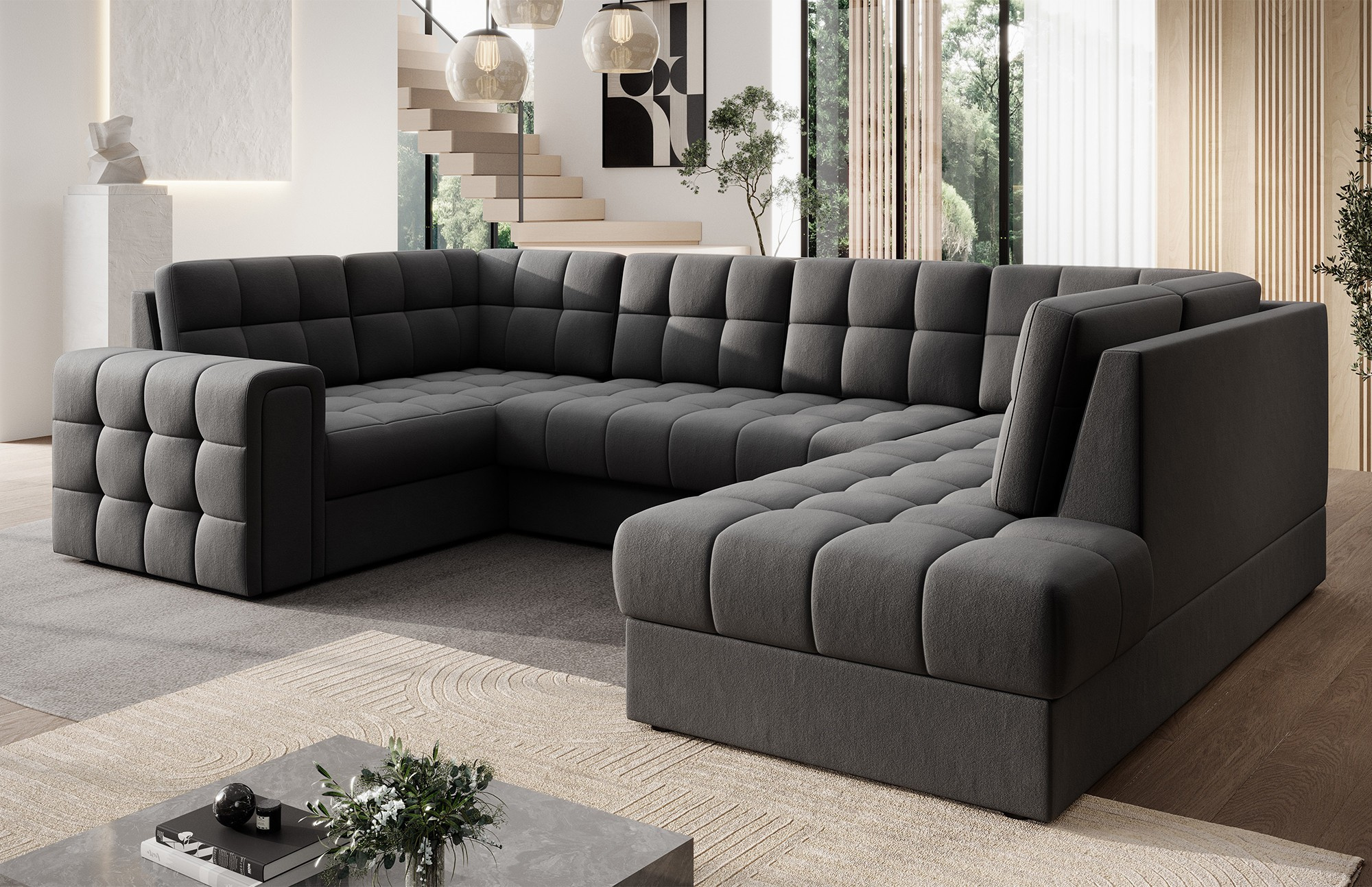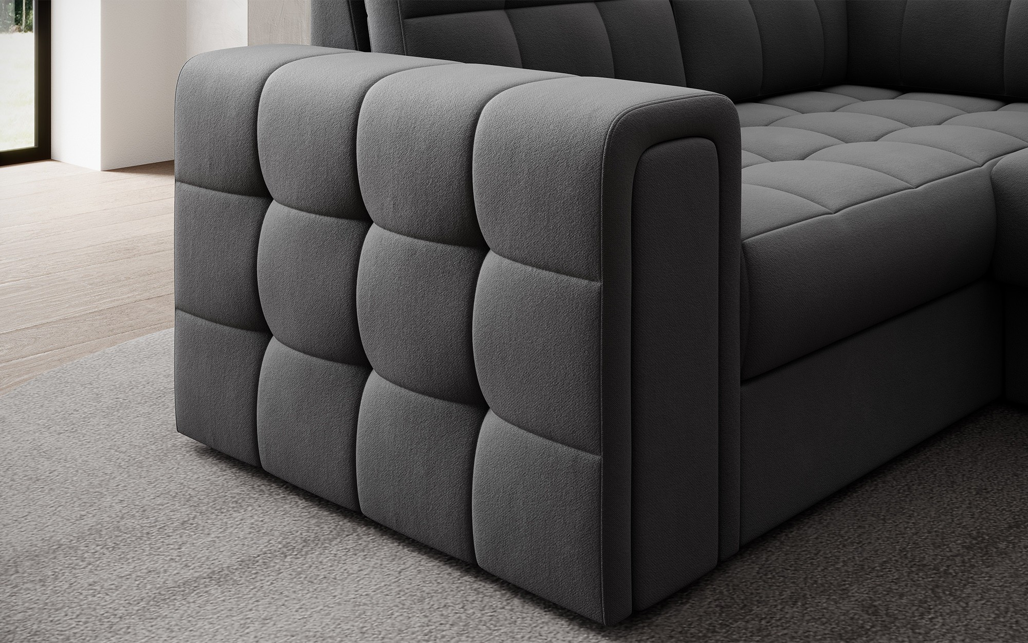 Moderní rohová rozkládací pohovka Blewett 299x198x82 cm je ideální volbou pro ty, kteří hledají elegantní a pohodlnou rohovou pohovku do svého obývacího pokoje.Rohová pohovka Blewett vyniká pohodlným sedákem vyrobeným z vlnových pružin typu B a polyuretanových pěn T2540 a T2130, což zajišťuje dlouhotrvající pohodlí a odolnost.Opěradlo je vyplněno pěnovou výplní, která se dokonale přizpůsobí tvaru zad, čímž zvyšuje komfort relaxace.Rohová sedací souprava Blewett v obývacím pokoji je vybavena spací funkcí typu Dolphin, která umožňuje rychlé rozložení, a praktickým úložným prostorem na lůžkoviny—ideální pro skladování.Tato moderní rohová pohovka Blewett má čalouněné opěradlo, díky čemuž vypadá skvěle v jakékoli části místnosti.Robustní černé plastové nohy zdůrazňují moderní styl pohovky.Vysoce kvalitní řemeslné zpracování, funkčnost a módní design činí z Blewettu vynikající rozkládací pohovku, která splňuje očekávání i těch nejnáročnějších uživatelů.