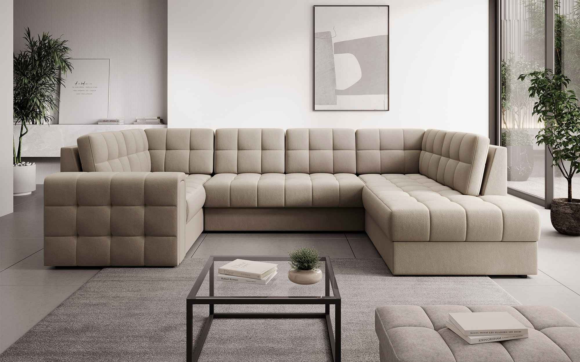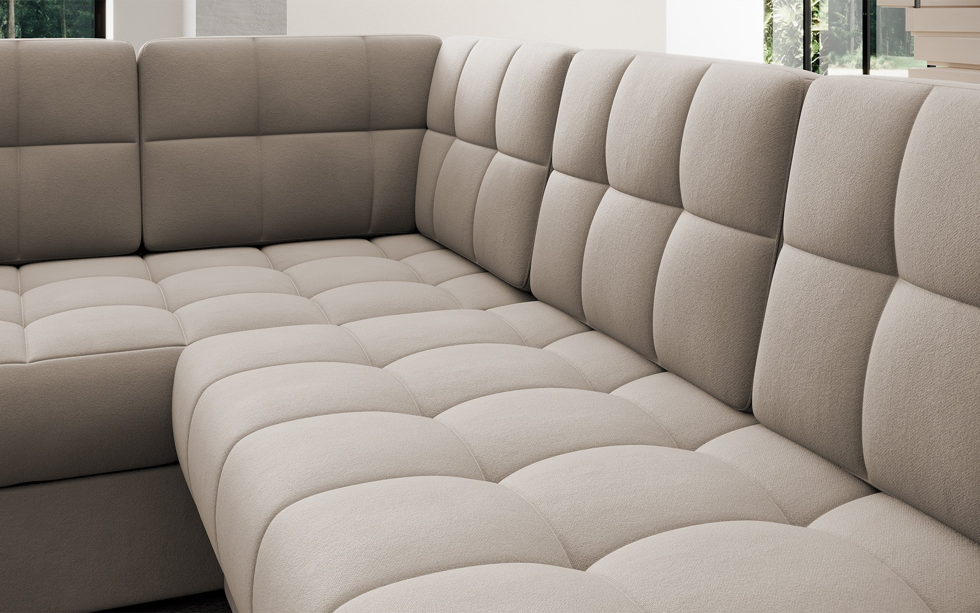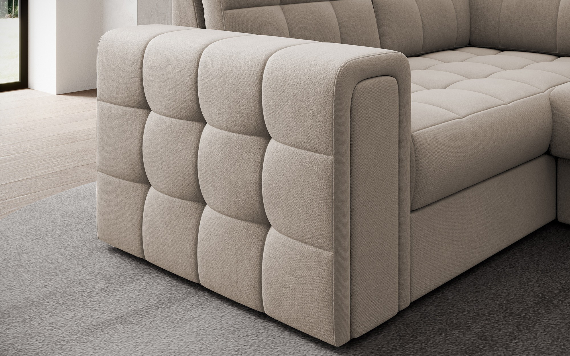 Moderní rohová rozkládací pohovka Blewett 299x198x82 cm je ideální volbou pro ty, kteří hledají elegantní a pohodlnou rohovou pohovku do svého obývacího pokoje.Rohová pohovka Blewett vyniká pohodlným sedákem vyrobeným z vlnových pružin typu B a polyuretanových pěn T2540 a T2130, což zajišťuje dlouhotrvající pohodlí a odolnost.Opěradlo je vyplněno pěnovou výplní, která se dokonale přizpůsobí tvaru zad, čímž zvyšuje komfort relaxace.Rohová sedací souprava Blewett v obývacím pokoji je vybavena spací funkcí typu Dolphin, která umožňuje rychlé rozložení, a praktickým úložným prostorem na lůžkoviny—ideální pro skladování.Tato moderní rohová pohovka Blewett má čalouněné opěradlo, díky čemuž vypadá skvěle v jakékoli části místnosti.Robustní černé plastové nohy zdůrazňují moderní styl pohovky.Vysoce kvalitní řemeslné zpracování, funkčnost a módní design činí z Blewettu vynikající rozkládací pohovku, která splňuje očekávání i těch nejnáročnějších uživatelů.