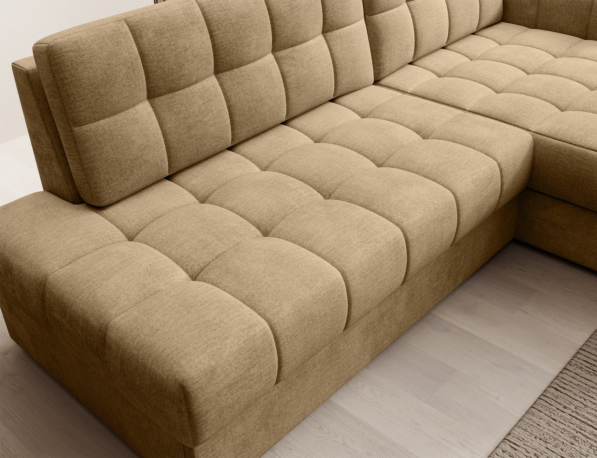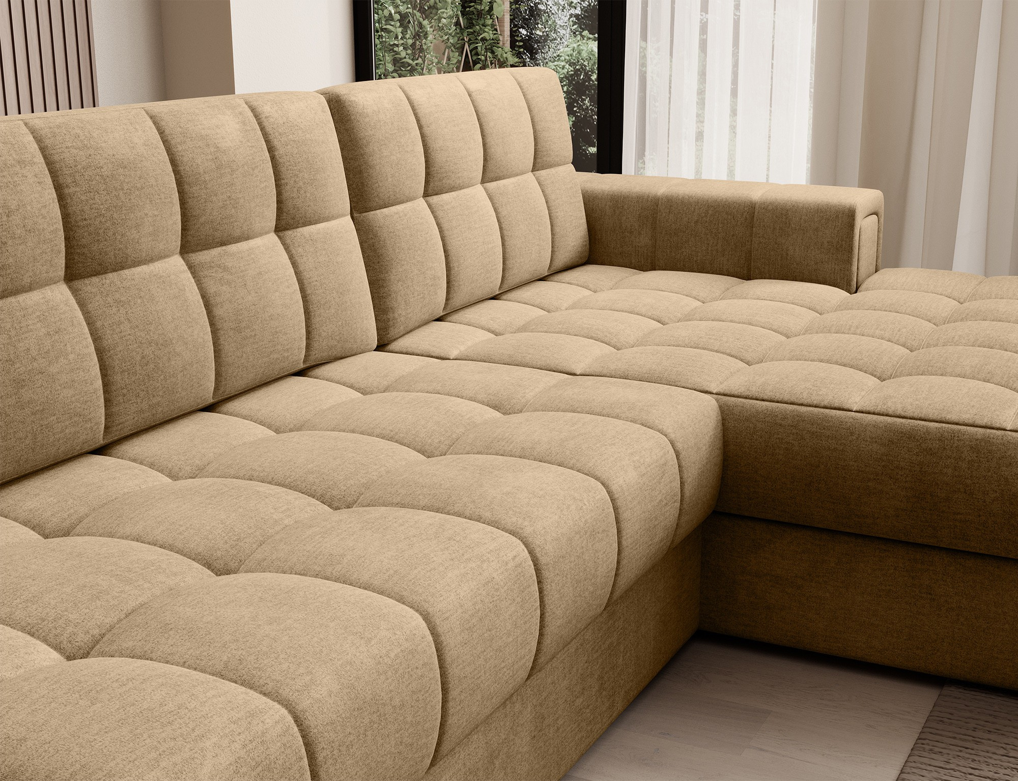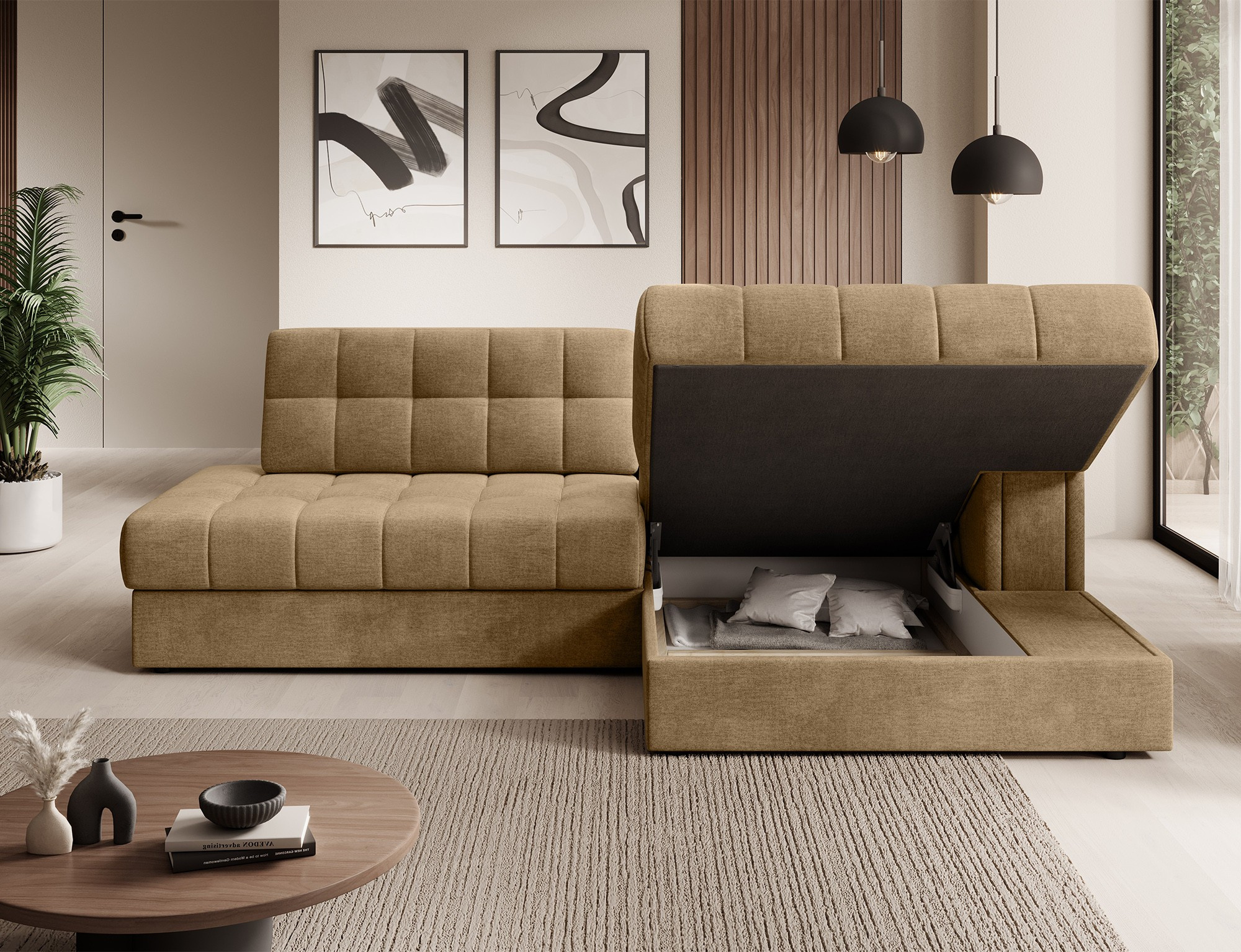 Jedním z hlavních rysů této sedací soupravy je její praktický úložný prostor. Už nikdy nebudete muset řešit, kam uložit deky, polštáře nebo sezónní dekorace. Všechny tyto věci můžete snadno a rychle uschovat do prostorného úložného prostoru, který je diskrétně integrován do designu soupravy.