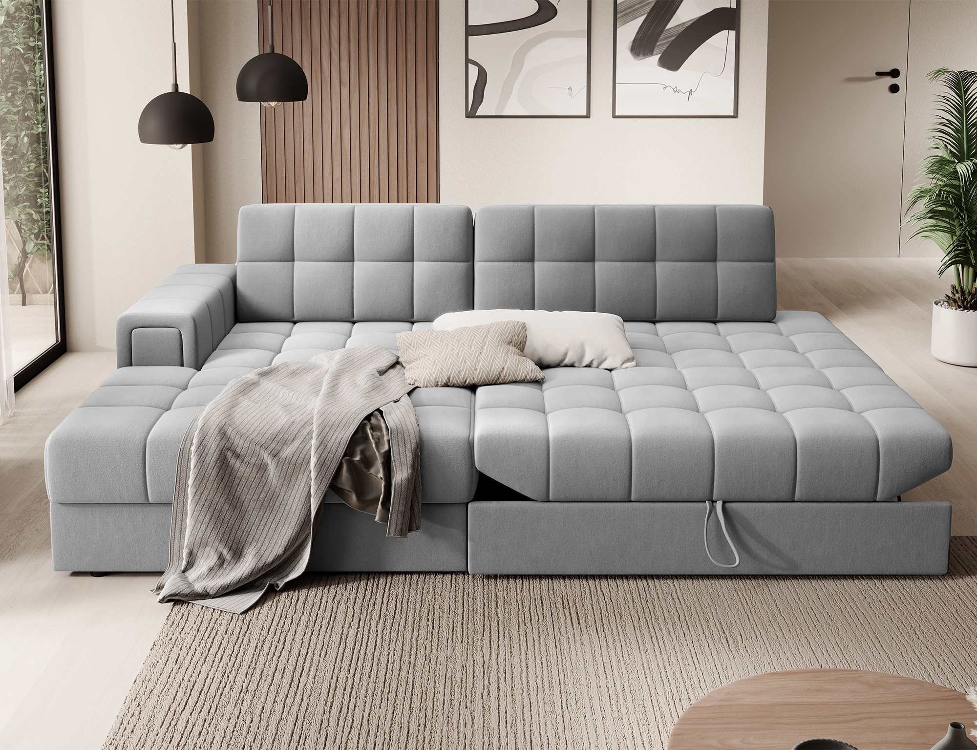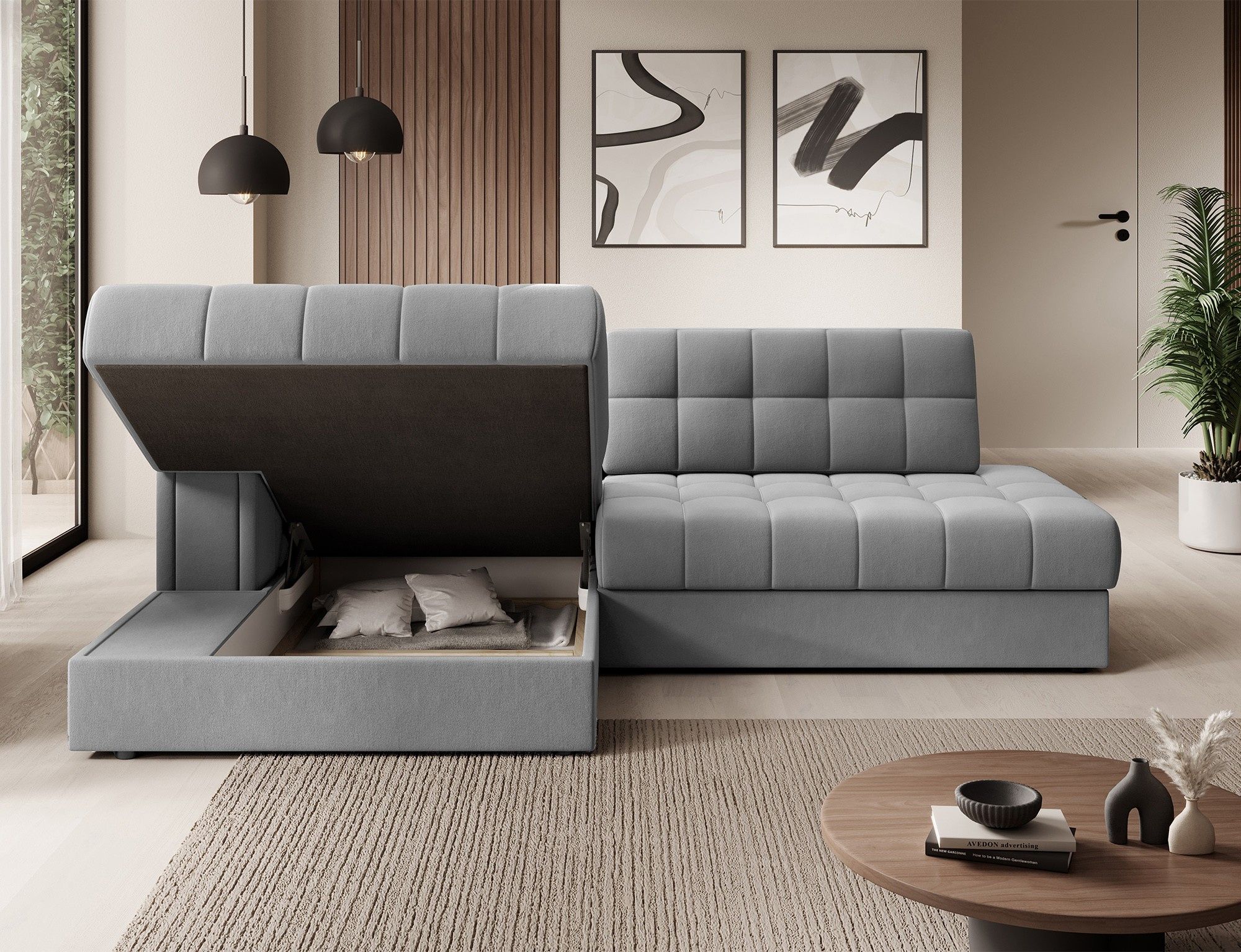 Jedním z hlavních rysů této sedací soupravy je její praktický úložný prostor. Už nikdy nebudete muset řešit, kam uložit deky, polštáře nebo sezónní dekorace. Všechny tyto věci můžete snadno a rychle uschovat do prostorného úložného prostoru, který je diskrétně integrován do designu soupravy.