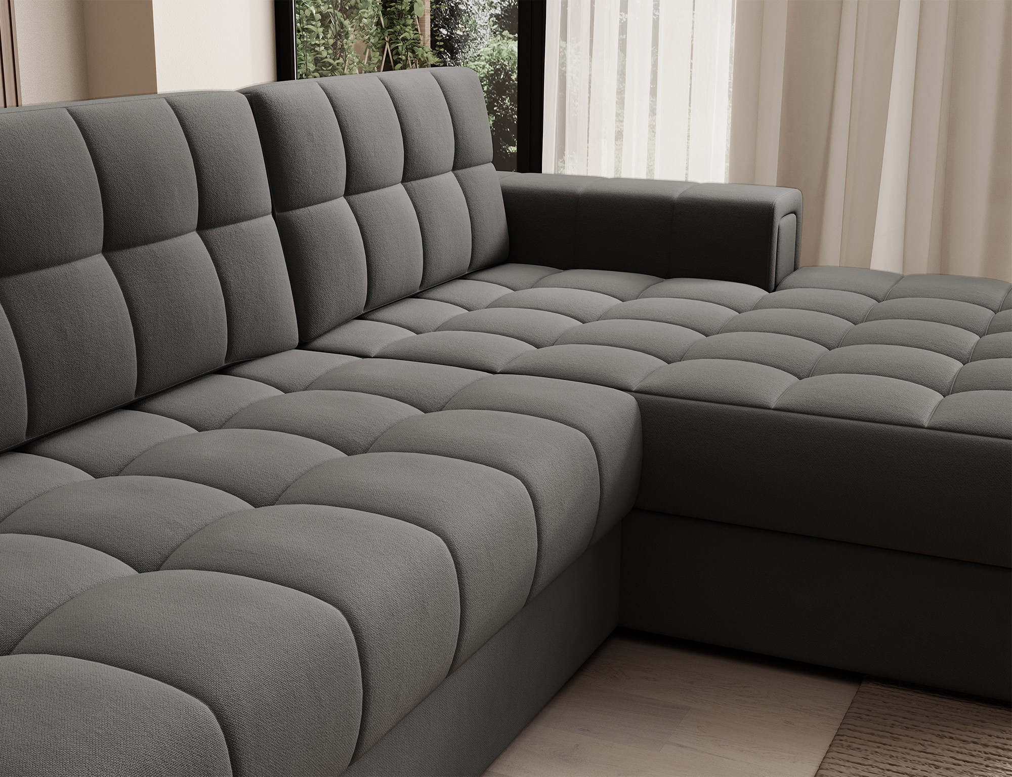 Rohová konstrukce sedací soupravy Blezalt umožňuje efektivní využití prostoru v místnosti. Je ideální pro umístění do rohu obývacího pokoje, čímž uvolníte více místa pro další nábytek nebo volný pohyb.