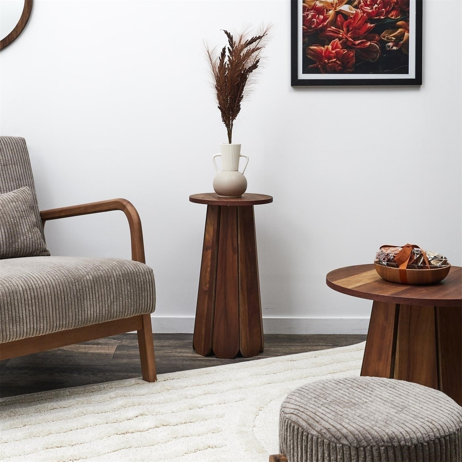 Boční stolek Will je vyroben z MDF desky s dýhou v barvě ořechového dřeva. Stolek s kulatou deskou je vybaven jedinou nohou, která se skládá z 8 dokonale profilovaných destiček. Stolek vyžaduje montáž. Max. zatížení stolku 15 kg