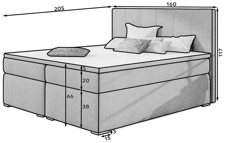 Celkové rozměry postele jsou 205 cm na délku a maximální výška je 117 cm. Tyto proporce zajišťují, že postel BOLERO se stane dominantním prvkem vaší ložnice, aniž by působila příliš masivně.
