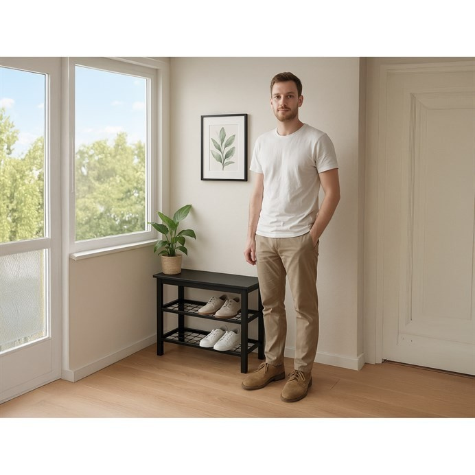 Stylový botník s lavicí značky Autronic přináší kombinaci pohodlí a praktičnosti. Černá sedací plocha z mdf nabízí komfort při obouvání, zatímco dvě prostorné kovové police poskytují dostatek místa pro uskladnění obuvi. Stabilní konstrukce z MDF a kovu zajišťuje odolnost a dlouhou životnost. Elegantní design v neutrálních tónech snadno zapadne do moderních i tradičních interiérů. Tento botník je ideální volbou pro předsíně, kde pomůže udržet pořádek a zároveň přidá praktický sedací prvek.