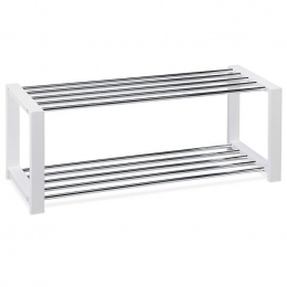 Botník s dvěma policemi nabízí praktické řešení pro uspořádání obuvi v předsíni či chodbě. Masivní rám z kaučukovníku je opatřen bílým matným lakem, který zajišťuje odolnost a snadnou údržbu, zatímco police jsou tvořeny chromovanými kovovými tyčemi, které dodávají botníku moderní vzhled a zároveň umožňují dobré větrání uložené obuvi. Stabilní provedení a pevné spoje zaručují dlouhou životnost a bezpečné uložení bot. Kompaktní rozměry usnadňují umístění i do menších prostor. Botník je vhodný pro různé typy obuvi a díky otevřenému designu se snadno čistí.