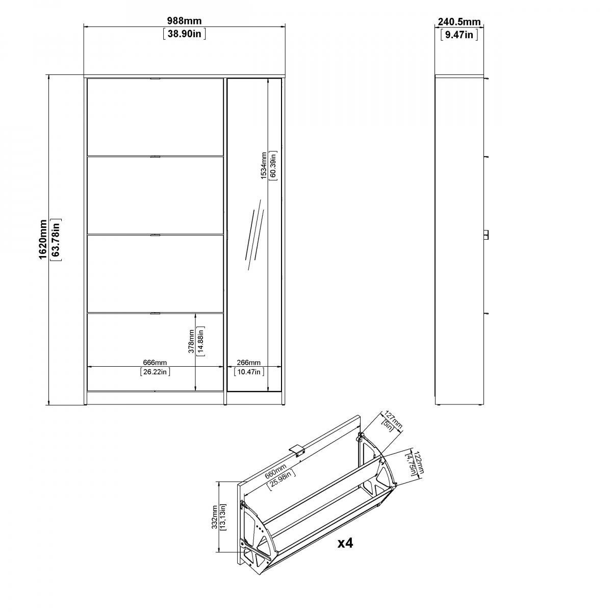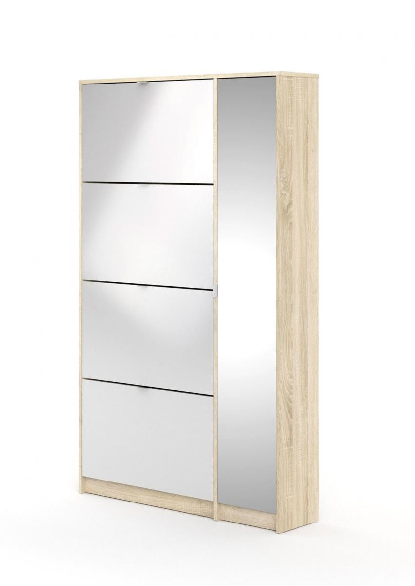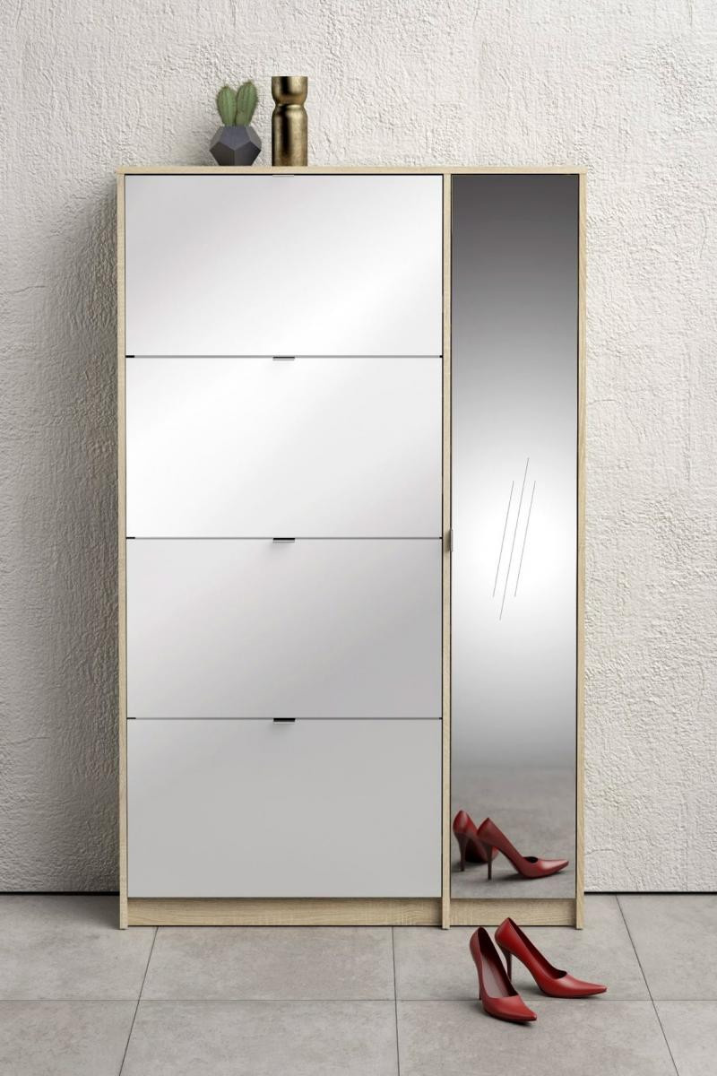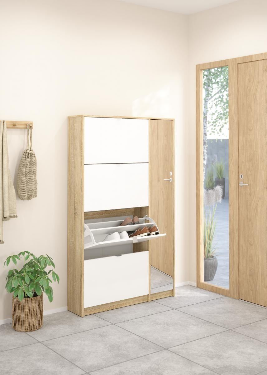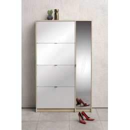 Po prostorném botníku touží každý milovník bot i početná rodina. Boty se hromadí v předsíni, vzniká chaos a zakopávání o boty je na denním pořádku. Zachraňte svou předsíň před nepořádkem a pořiďte si tento úžasný botník s výklopnými dvířky a skříňkou se zrcadlem. Díky svému provedení pojme botník Flap opravdu velké množství bot. Do každé výklopné přihrádky můžete ukládat boty a skříňka poslouží např. k ukládání přípravků na čištění a údržbu bot, nebo k odložení drobných svršků jako jsou čepice, rukavice atd...Botník je vyrobený z lamina, které je odolné a snadné na údržbu. Botník je dodávaný v demontu. Součástí balení je montážní návod včetně všech spojovacích prvků. Vyobrazené doplňky a dekorace nejsou v ceně.