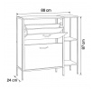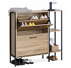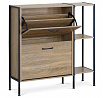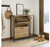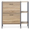 Botník v dekoru dub kombinuje praktické úložné prostory s moderním designem. Je vyroben z MDF desek s povrchovou úpravou v odstínech přírodního dřeva, která je snadno udržovatelná. Nabízí dvě přihrádky s výklopnými dvířky pro uložení obuvi a tři otevřené police na doplňky nebo dekorace. Černé kovové nohy a úchytky dodávají botníku stabilitu a industriální vzhled. Kompaktní rozměry umožňují umístění do předsíní i menších prostor.