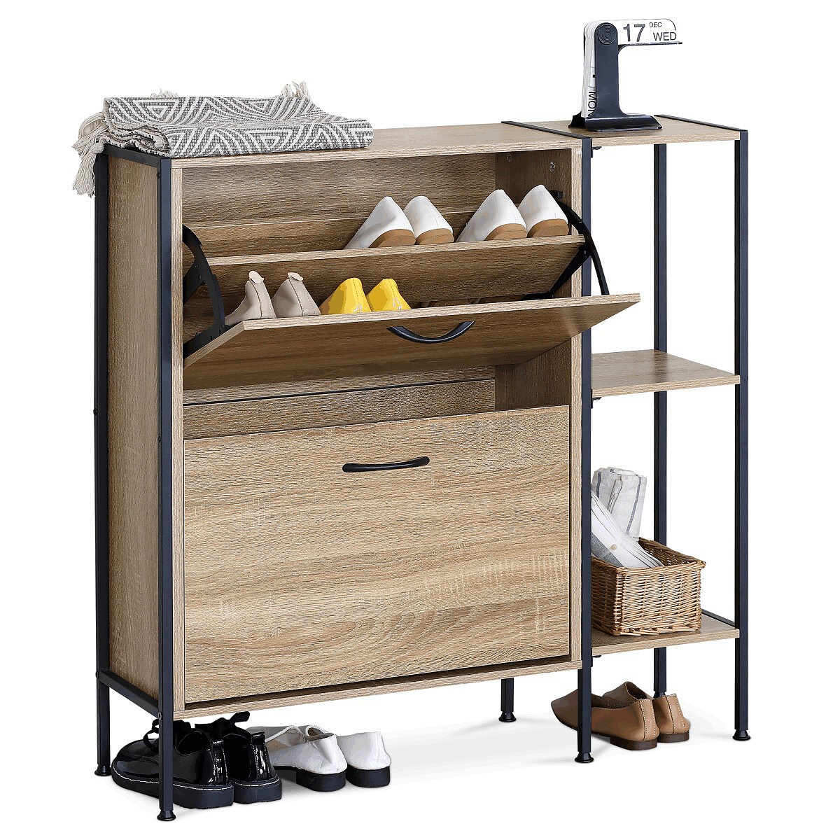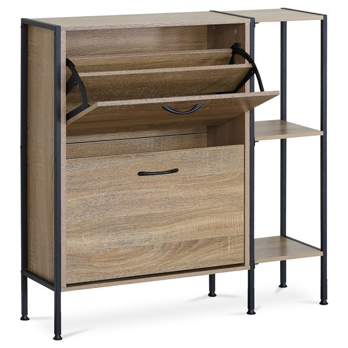 Botník v dekoru dub kombinuje praktické úložné prostory s moderním designem. Je vyroben z MDF desek s povrchovou úpravou v odstínech přírodního dřeva, která je snadno udržovatelná. Nabízí dvě přihrádky s výklopnými dvířky pro uložení obuvi a tři otevřené police na doplňky nebo dekorace. Černé kovové nohy a úchytky dodávají botníku stabilitu a industriální vzhled. Kompaktní rozměry umožňují umístění do předsíní i menších prostor.