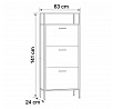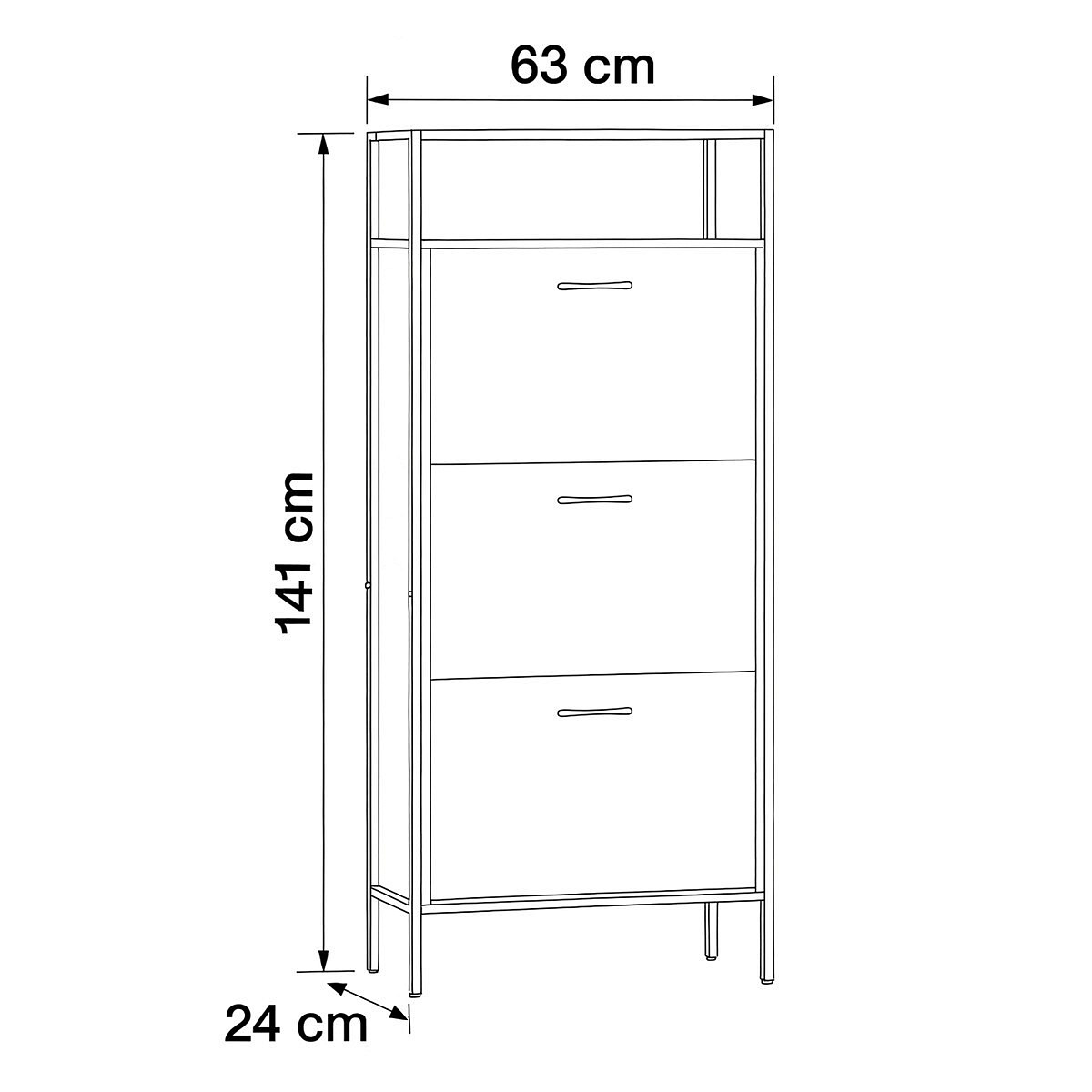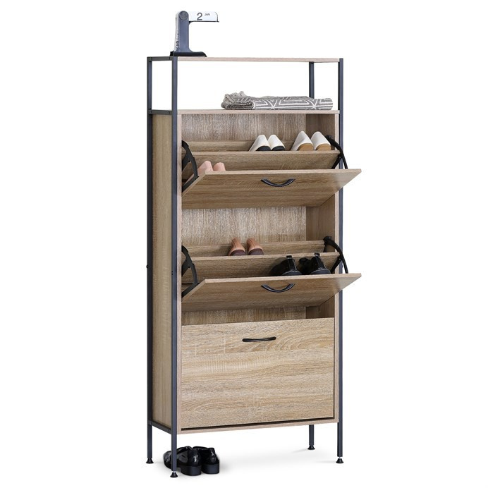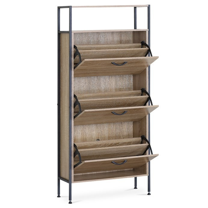 Botník s třemi přihrádkami a dvěma policemi nabízí praktické řešení pro uspořádání obuvi v domácnosti. Desky jsou vyrobeny z MDF v dekoru dub, který přináší přírodní odstíny a decentní strukturu dřeva. Stabilní kovová podnož zajišťuje pevnou oporu a lehkost celkového provedení. Každá přihrádka je opatřena černou úzkou úchytkou pro snadné otevírání a zavírání. Kompaktní rozměry umožňují umístění do předsíně či chodby, kde efektivně využije prostor a udrží pořádek.