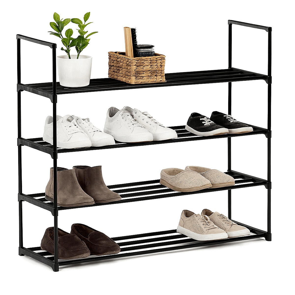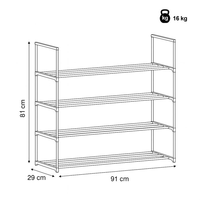 Prostorný botník značky Autronic nabízí elegantní a praktické řešení pro uskladnění obuvi. Černá kovová konstrukce s čtyřmi policemi pojme velké množství párů bot, takže je ideální i pro větší domácnosti. Díky otevřenému designu je obuv snadno přístupná a dobře větraná. Botník je stabilní, lehký a snadno přemístitelný, což ho činí vhodným doplňkem do předsíně, šatny či garáže.
