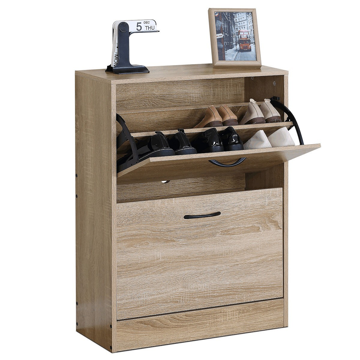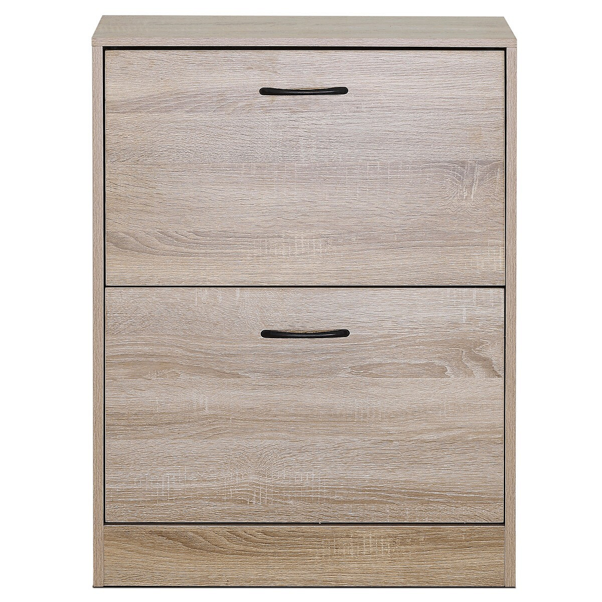 Botník s dvěma přihrádkami v dekoru dub je vyroben z MDF desek s povrchovou úpravou, která napodobuje přirozenou strukturu dřeva. Praktický design umožňuje uložení obuvi do dvou samostatných prostorů s výklopnými dvířky, která jsou opatřena černými kovovými úchytkami pro snadnou manipulaci. Kompaktní rozměry botníku jej předurčují pro umístění v předsíních či menších prostorách, kde oceníte pořádek a rychlý přístup k obuvi. Stabilní provedení a kvalitní materiál zajišťují dlouhou životnost a snadnou údržbu. Botník je vhodný pro uložení několika párů bot, čímž pomáhá udržet vstupní prostor čistý a organizovaný.