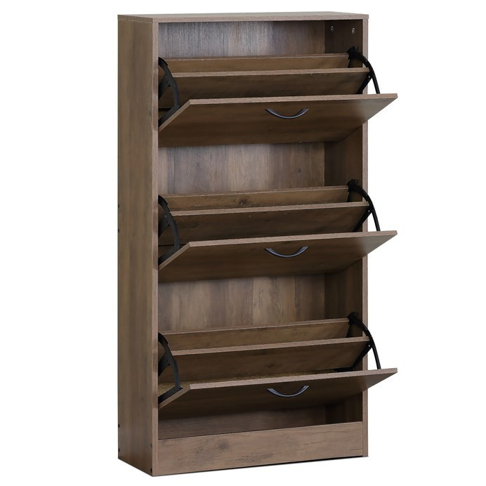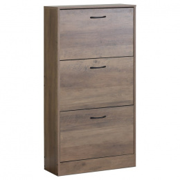 Botník s třemi přihrádkami v dekoru jilmového dřeva je vyroben z MDF desek s povrchovou úpravou, která napodobuje přirozenou strukturu dřeva. Každá přihrádka nabízí dostatek prostoru pro uskladnění obuvi a je opatřena černými kovovými úchytkami pro snadné otevírání. Kompaktní rozměry botníku umožňují jeho umístění i do menších prostor, přičemž pevná konstrukce zajišťuje stabilitu a dlouhou životnost. Praktické řešení v podobě tří samostatných přihrádek pomáhá udržet pořádek a přehlednost v domácnosti. Botník je vhodný do předsíní, chodeb či šaten, kde efektivně využije dostupné místo.