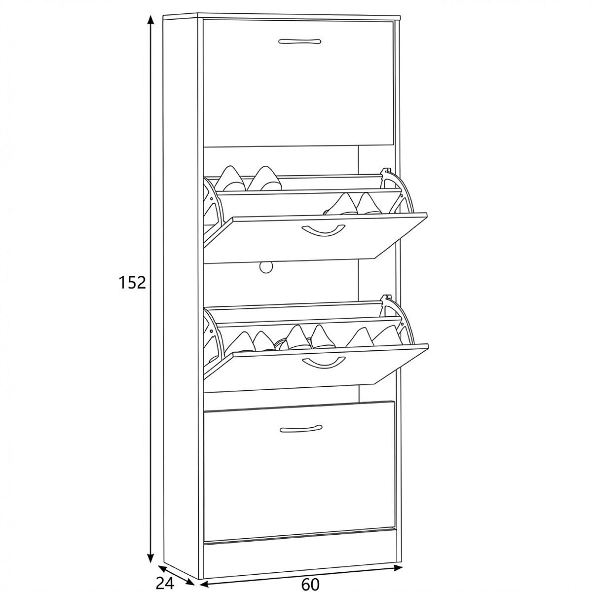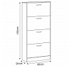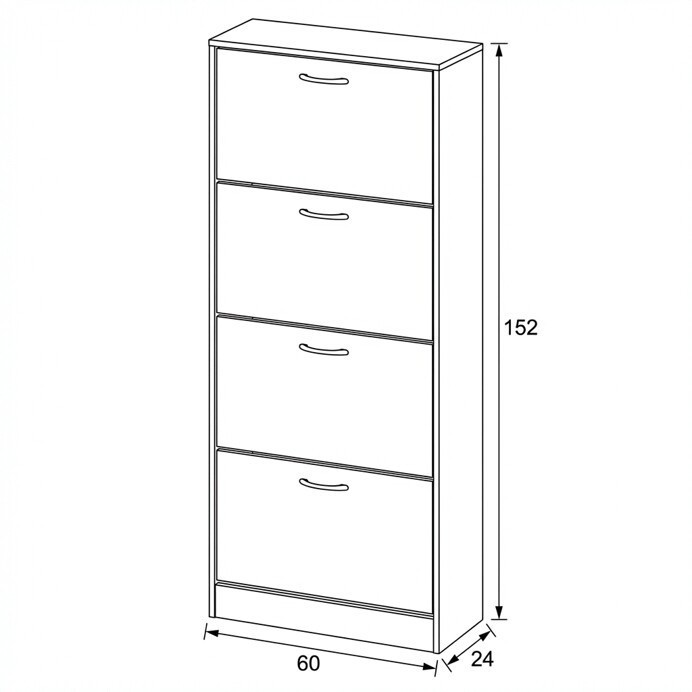 Botník s čtyřmi samostatnými přihrádkami nabízí praktické řešení pro uspořádání obuvi v předsíni či chodbě. Vyroben je z MDF desek s dekorativní povrchovou úpravou v odstínu dub, která napodobuje strukturu dřeva a snadno se udržuje. Každá přihrádka je vybavena černou úzkou úchytkou pro pohodlné otevírání. Kompaktní tvar a vertikální uspořádání šetří místo a zároveň poskytuje dostatek úložného prostoru. Botník je stabilní a navržený pro dlouhou životnost v domácím prostředí.