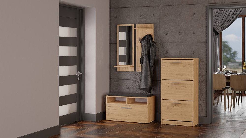 Nadčasový botník Pura s praktickými výklopnými dvířky je ideální volbou do každé předsíně. Pečlivé zpracování a minimalistický design dodají vaší předsíni styl i funkční úložný prostor. Nábytek je vyroben z vysoce kvalitního lamina, které je snadno udržovatelné a odolné proti oděru, dlouhou životnost nábytku zajišťují hrany zakončené ABS materiálem.