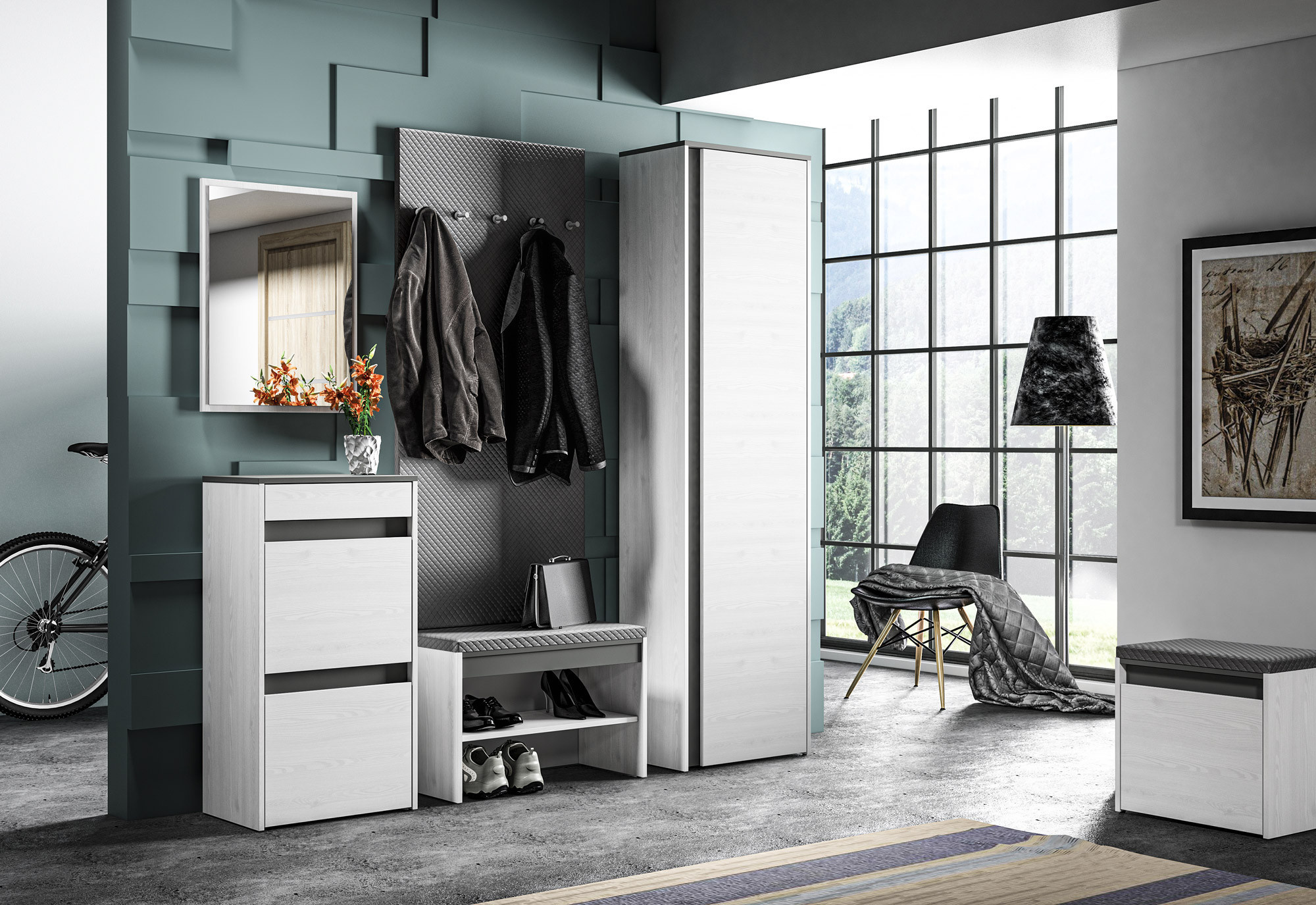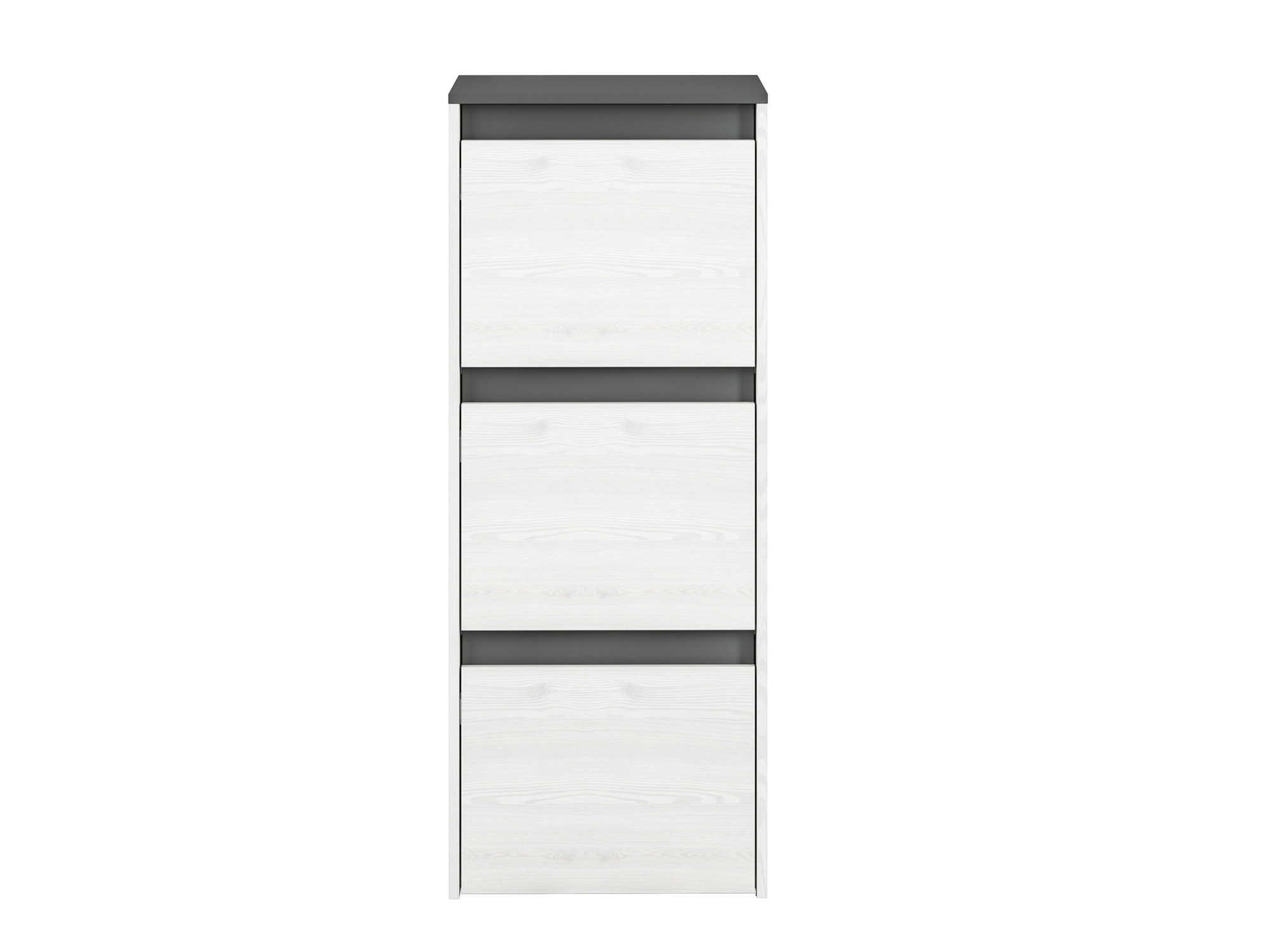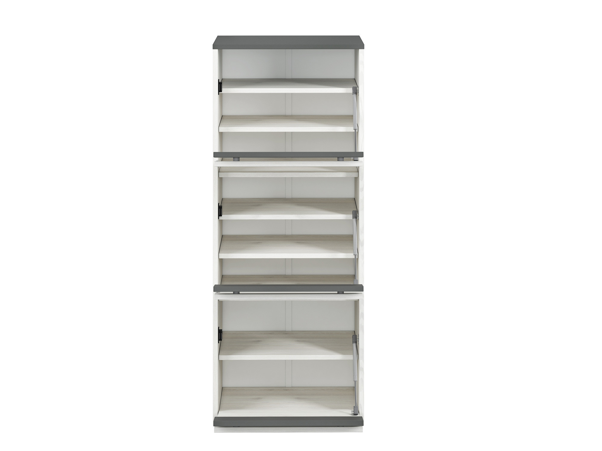 Botník HYGA 05 je mimořádně funkční kus nábytku do předsíně. Světlý dekor sněhové borovice opticky zvětší halu, zatímco antracitově zbarvené vložky a horní část dodají interiéru na zajímavosti.