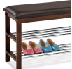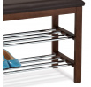 Botník s taburetem v hnědém odstínu je vyroben z masivu kaučukovníku s mořením na ořech, což zajišťuje pevné a stabilní tělo. Sedák je potažen kvalitní hnědou ekokůží, která se snadno udržuje a přispívá k pohodlnému sezení. Dvě chromované police nabízejí praktický prostor pro uložení obuvi, přičemž jejich lesklý povrch kontrastuje s teplým dřevem rámu. Kompaktní rozměry a pevné provedení umožňují využití v předsíních i menších prostorách. Celková kombinace materiálů a designu vytváří funkční a estetický doplněk interiéru.