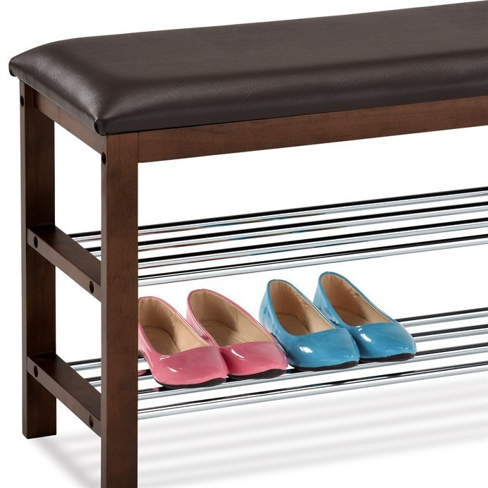Botník s taburetem v hnědém odstínu je vyroben z masivu kaučukovníku s mořením na ořech, což zajišťuje pevné a stabilní tělo. Sedák je potažen kvalitní hnědou ekokůží, která se snadno udržuje a přispívá k pohodlnému sezení. Dvě chromované police nabízejí praktický prostor pro uložení obuvi, přičemž jejich lesklý povrch kontrastuje s teplým dřevem rámu. Kompaktní rozměry a pevné provedení umožňují využití v předsíních i menších prostorách. Celková kombinace materiálů a designu vytváří funkční a estetický doplněk interiéru.