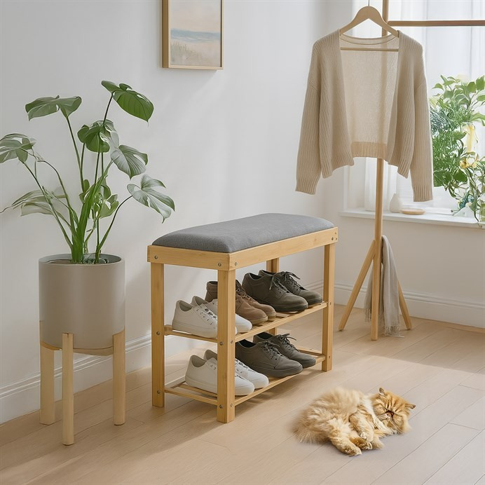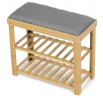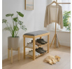 Botník a taburet DR-N1010 GREY2 značky Autronic kombinuje funkčnost s přírodní estetikou díky konstrukci z masivního bambusu v přírodním odstínu, která zajišťuje pevnost a dlouhou životnost. Sedák je čalouněný šedou látkou s jemnou strukturou, která poskytuje pohodlné posezení a zároveň doplňuje minimalistický design. Dvě police tvořené bambusovými latěmi nabízejí praktický úložný prostor pro uložení obuvi nebo drobných předmětů, přičemž otevřená konstrukce umožňuje cirkulaci vzduchu a snadnou údržbu. Robustní rám je sestavený pomocí kovových spojovacích prvků, které zvyšují stabilitu celého výrobku. Kompaktní rozměry a ergonomické tvarování sedáku zajišťují komfortní sezení i v menších prostorách, což činí botník vhodným do předsíní či chodeb s omezeným prostorem. Nosnost výrobku odpovídá běžnému zatížení při sezení a ukládání obuvi, což zaručuje jeho všestranné využití v domácnostech s důrazem na přírodní materiály a jednoduchý design.