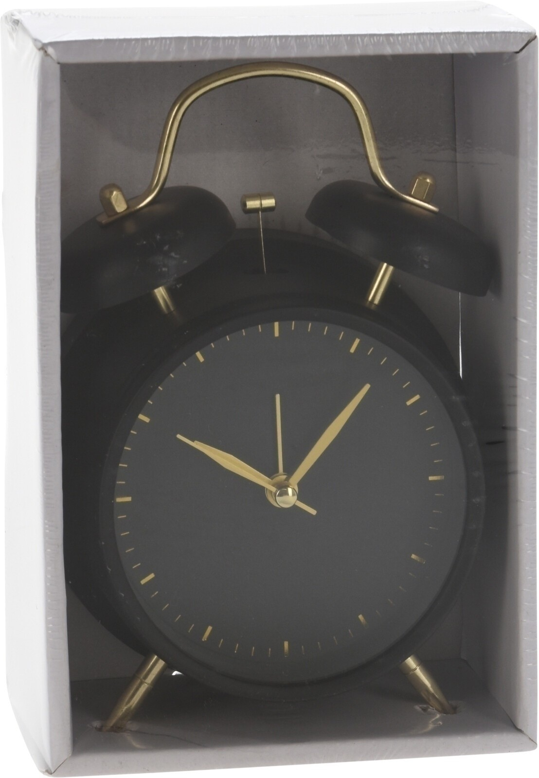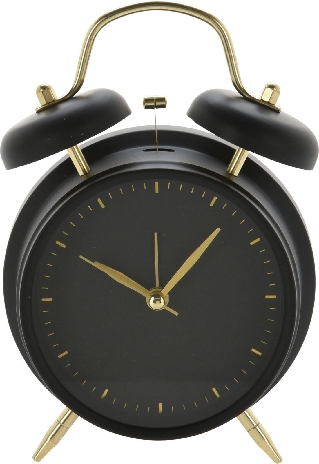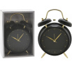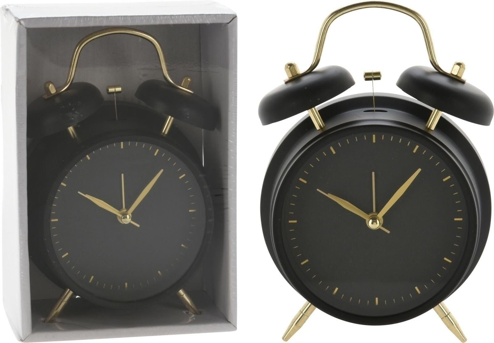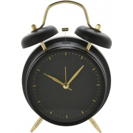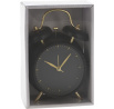 Hodiny - budík ve vintage stylu jsou určitě dekorací hodnou stylové ložnice nebo obývacího pokoje. Budík byl vyroben z kovu. Jeho černý ciferník, pouzdro a černé zvonky doplňují zlaté nožky a ručičky. Budík má výrazný ciferník, jeho ručičky také zajímavě kontrastují s černým číselníkem. Budík má sekundovou ručičku a další ručičku, díky které můžeme nastavit čas buzení. Rozměry kartonu: 13x6,2x18 cm.