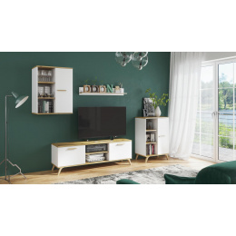 Sestava se skládá z TV stolku, závěsné skříňky, malé knihovny a polic.