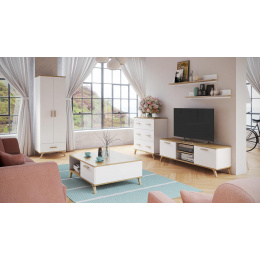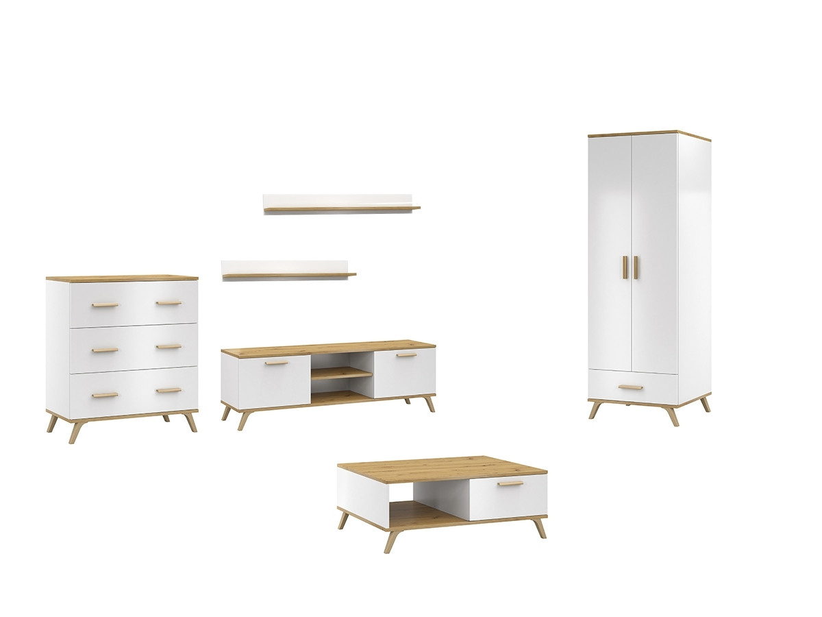 Sestava se skládá z konferenčního stolku, TV stolku, komody s šuplíky, dvou polic a vysoké skříně.