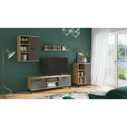 Sestava se skládá z TV stolku, závěsné skříňky, malé knihovny a police.