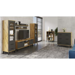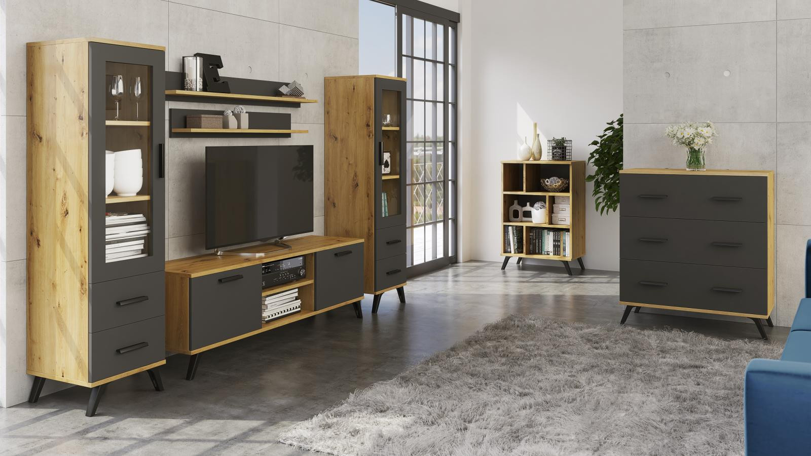 Roky Grafit je moderní bytová sestava v kombinaci 2 módních barev, grafit a dub artisan. Je vyrobena z vysoce kvalitní laminované dřevotřísky tloušťky 18 mm, odolné vůči poškrábání, vlhkosti a vysokým teplotám. Všechny hrany jsou opatřeny ABS lištou, která zajistí trvanlivost a odolnost proti nárazu. Díky této bytové stěně budete mít pohodlný i praktický interiér a také útulné a bezpečné prostředí, ve kterém se každý bude cítit dobře. Veškeré díly, které tato sestava obsahuje, si můžete objednat samostatně. Všechny prvky této sestavy jsou dodávány v demontu. Součástí je montážní plánek včetně všech potřebných spojovacích materiálů. Vyobrazené dekorace nejsou v ceně.
