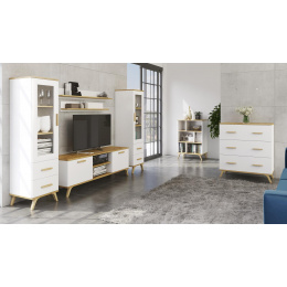 Sestava se skládá z 2ks skříně prosklené, TV stolku, komody s šuplíky, dvou polic a malé knihovny.