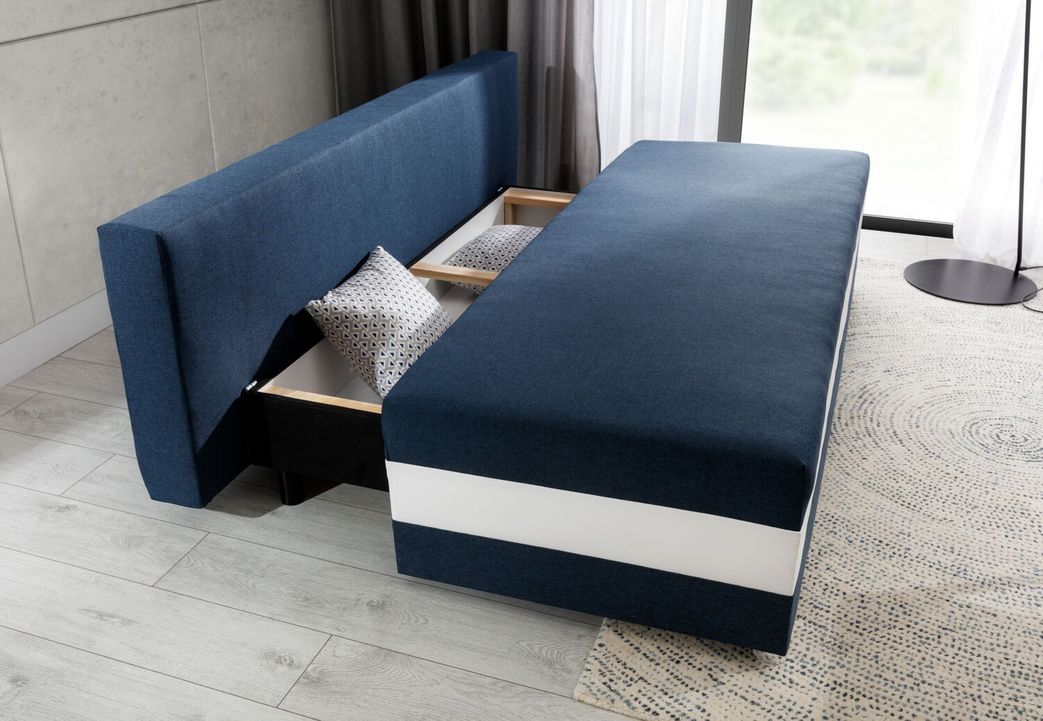 - Úložný prostor: Pohovka CALIA je vybavena praktickým úložným prostorem, který je ideální pro uschování ložního prádla, polštářů nebo jiných předmětů, které chcete mít po ruce, ale zároveň je mít úhledně uklizené.