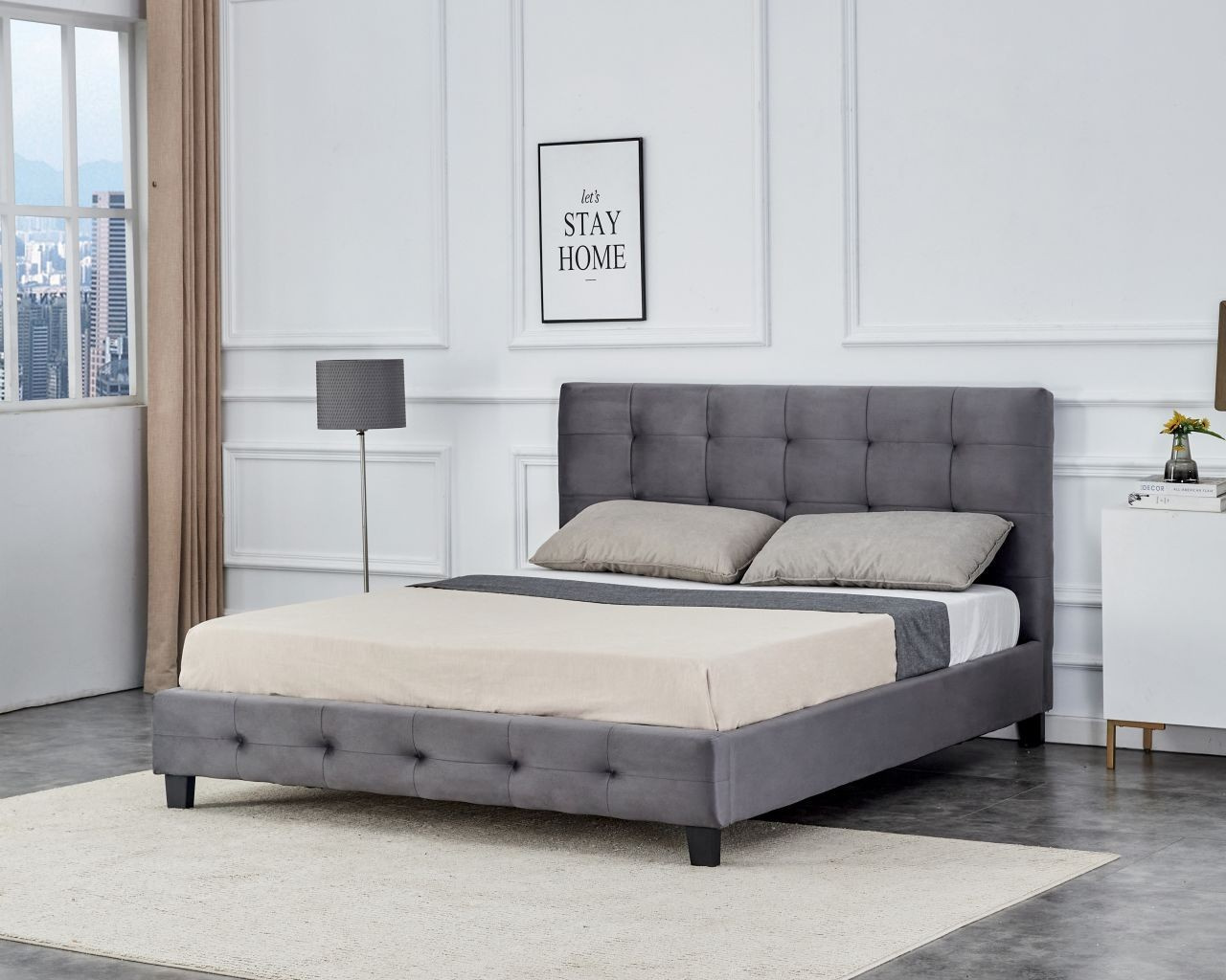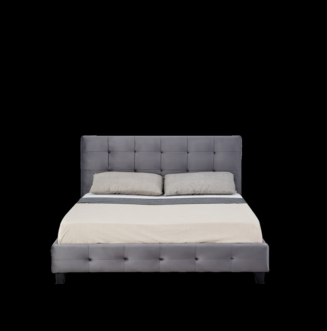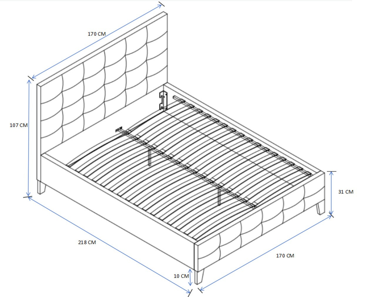 Rozměry: - celková délka: 218 cm - celková šířka: 170 cm - výška (bez matrace): 31 cm - výška čela: 107 cm - plocha na spaní: 160x200 cm Materiál: - látka: samet - rám: kov lakovaný práškovou barvou - lamely: pružné z překližky - nohy: dřevěné Ostatní: - rošt v sadě - počet lamel: po 16 ks ve dvou řadách - postel prodávána bez matrace Barva: - čalounění: šedá - nohy: černá
