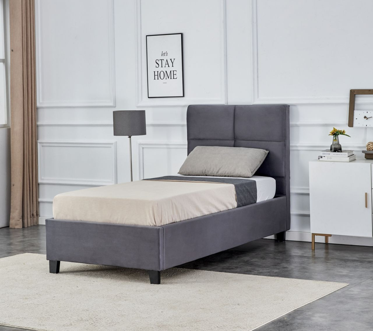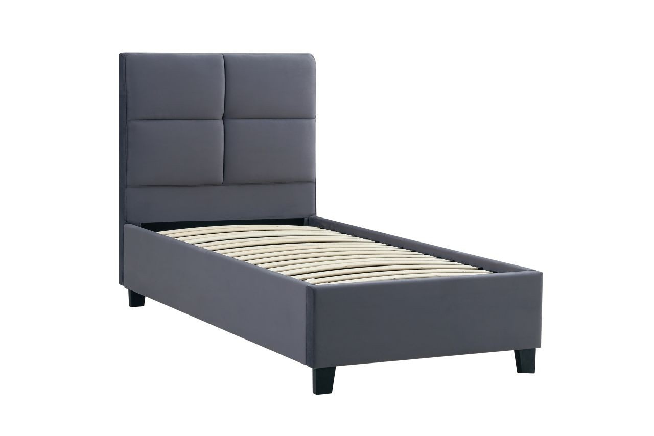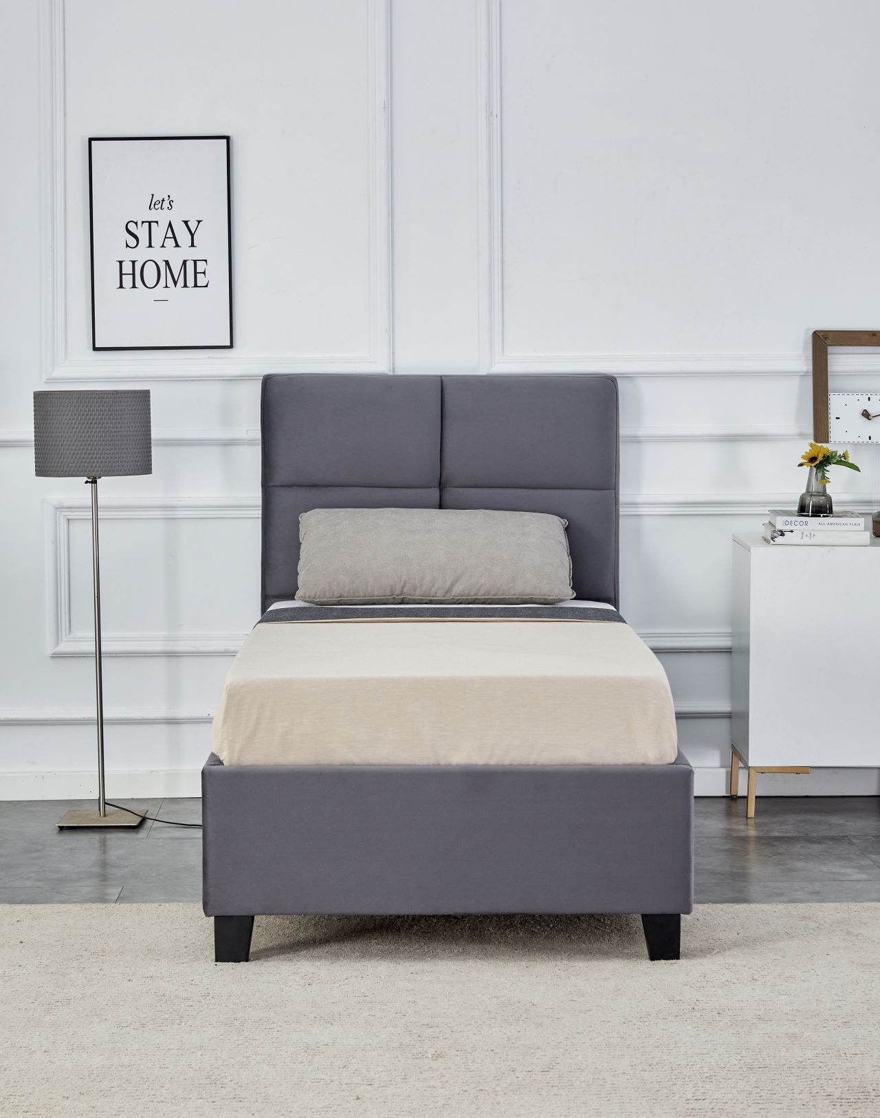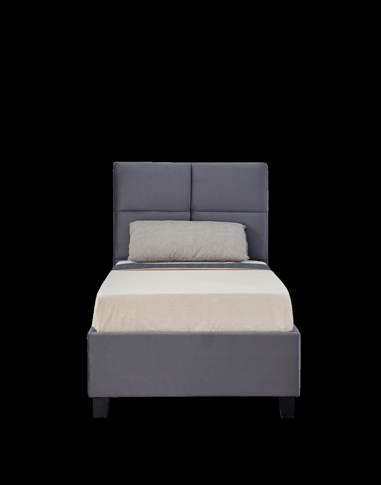 Rozměry: - celková délka: 216 cm - celková šířka: 100 cm - výška (bez matrace): 40 cm - výška čela: 120 cm - plocha na spaní: 90x200 cm Materiál: - látka: samet - rám: kov lakovaný práškovou barvou - lamely: pružné z překližky Ostatní: - rošt v sadě - počet lamel: 18 ks- postel prodávaná bez matrace Barva: - šedá