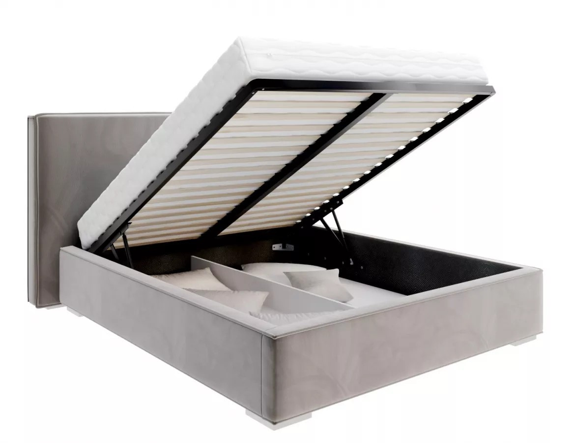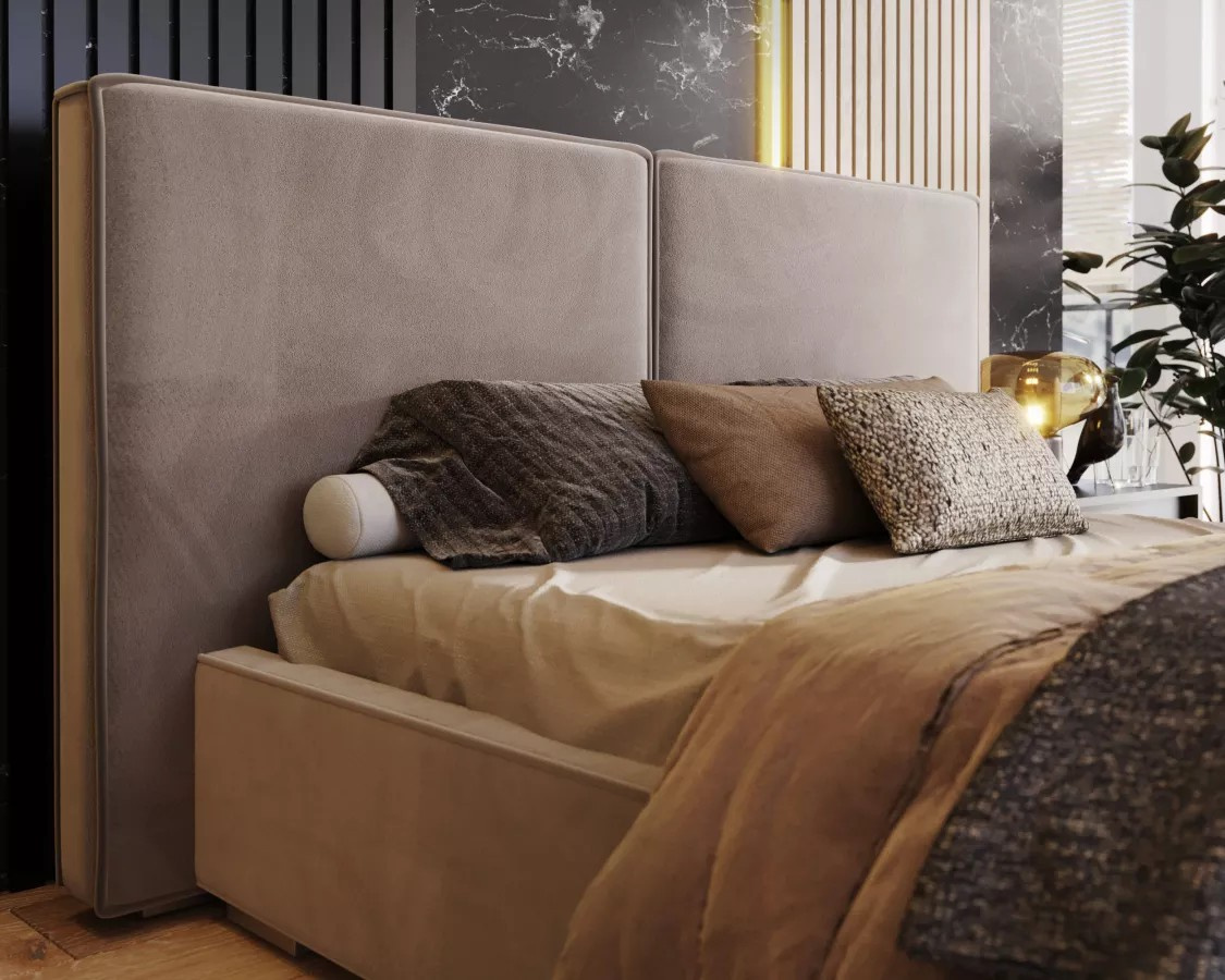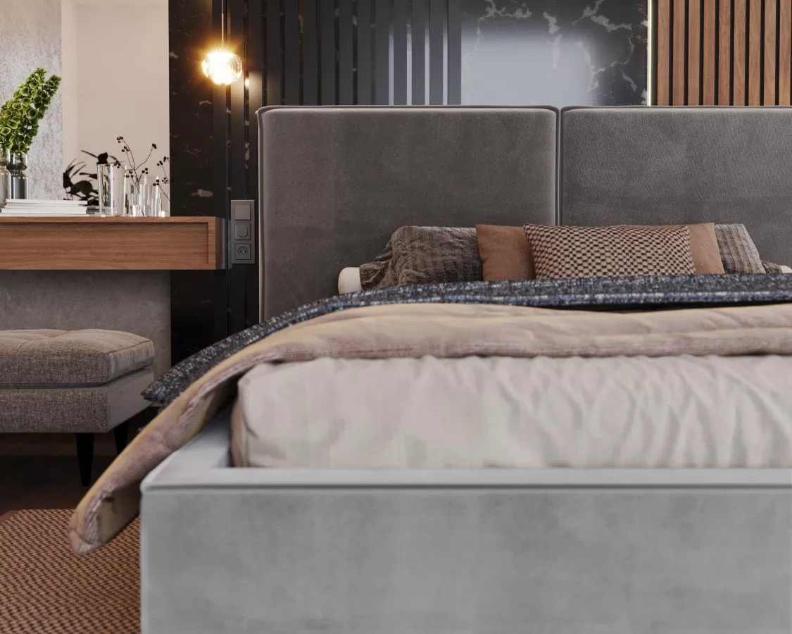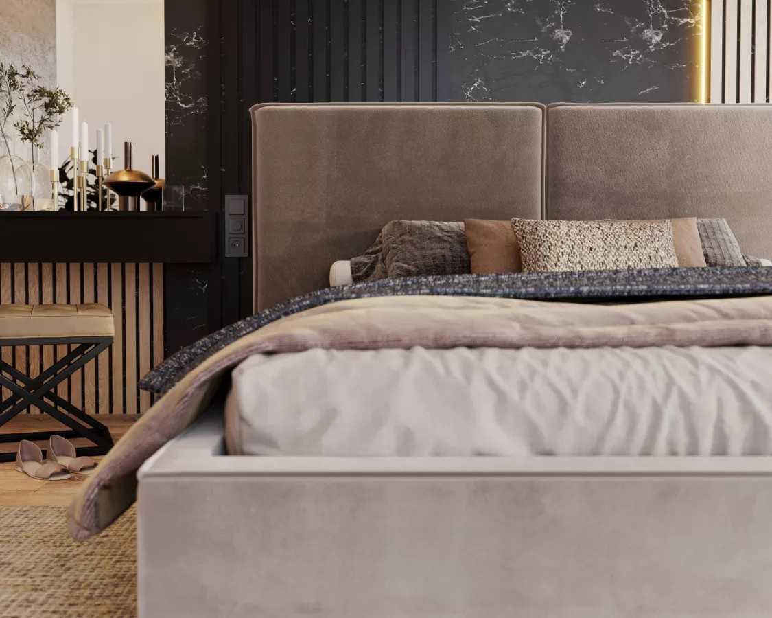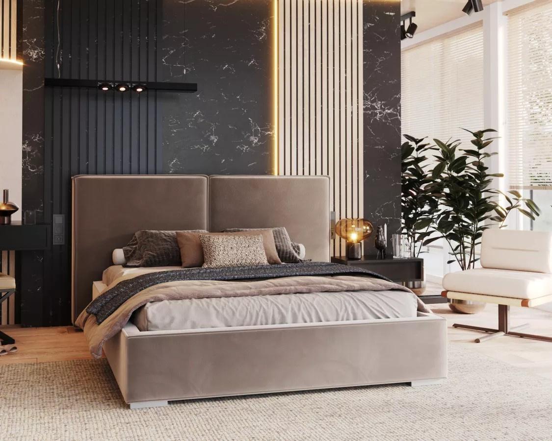 Čalouněná postel DOVER Pohodlná a přizpůsobená postel je zárukou dobře strávené noci. Ovlivní to nejen kvalitu spánku, ale také estetiku ložnice a vnímání místnosti. Hledáte-li originální řešení, stojí za to věnovat pozornost čalouněné posteli DOVER. Model zaujme zajímavým designem a funkčními řešeními. Čalouněná postel DOVER se dokonale hodí do nejnovějších trendů – skvěle se uplatní v ložnicích zařízených v moderním nebo minimalistickém stylu. Pozornost přitahuje především široké čelo postele, které dokonale přiléhá ke zdi a dodává interiéru neotřelý charakter. Jeho každodenní používání významně ovlivní vaši pohodu a způsobí, že každý den začne perfektně. Plochý čelo postele DOVER má klasický tvar a jeho minimalismus narušuje viditelné, módní prošívání.