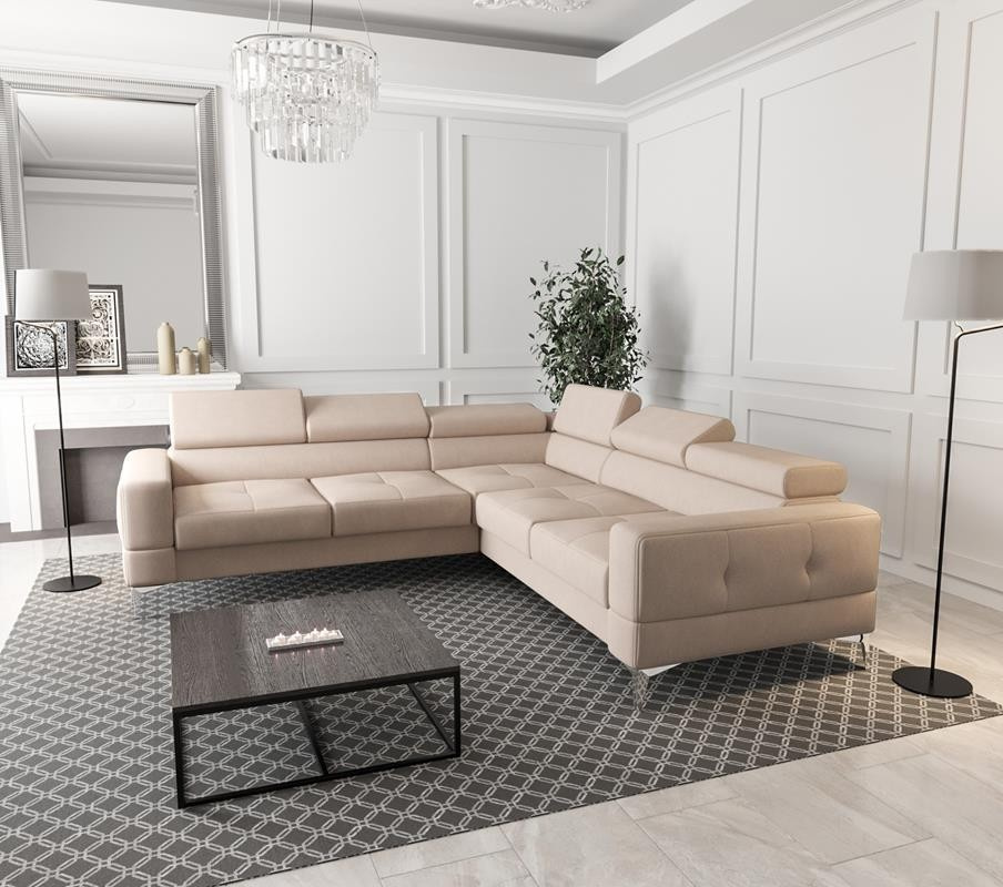 Rohové sedací soupravy mají funkci spaní a úložný prostor na ložní prádlo. Regulovatelné, vícestupňové opěrky hlavy umožňují přizpůsobení individuální poloze těla. Vysoké chromované nožky o výšce 13 cm dodávají štíhlost a podtrhují originální styl nábytku. Sedáky s ozdobným prošíváním, vyrobené na vlnitých pružinách a vysoce elastické pěně, což zajišťuje vysoký komfort používání a zabraňuje deformaci nejčastěji používaných ploch. POZOR!!! Na aranžmá je zobrazen rohový gauč bez funkce spaní.