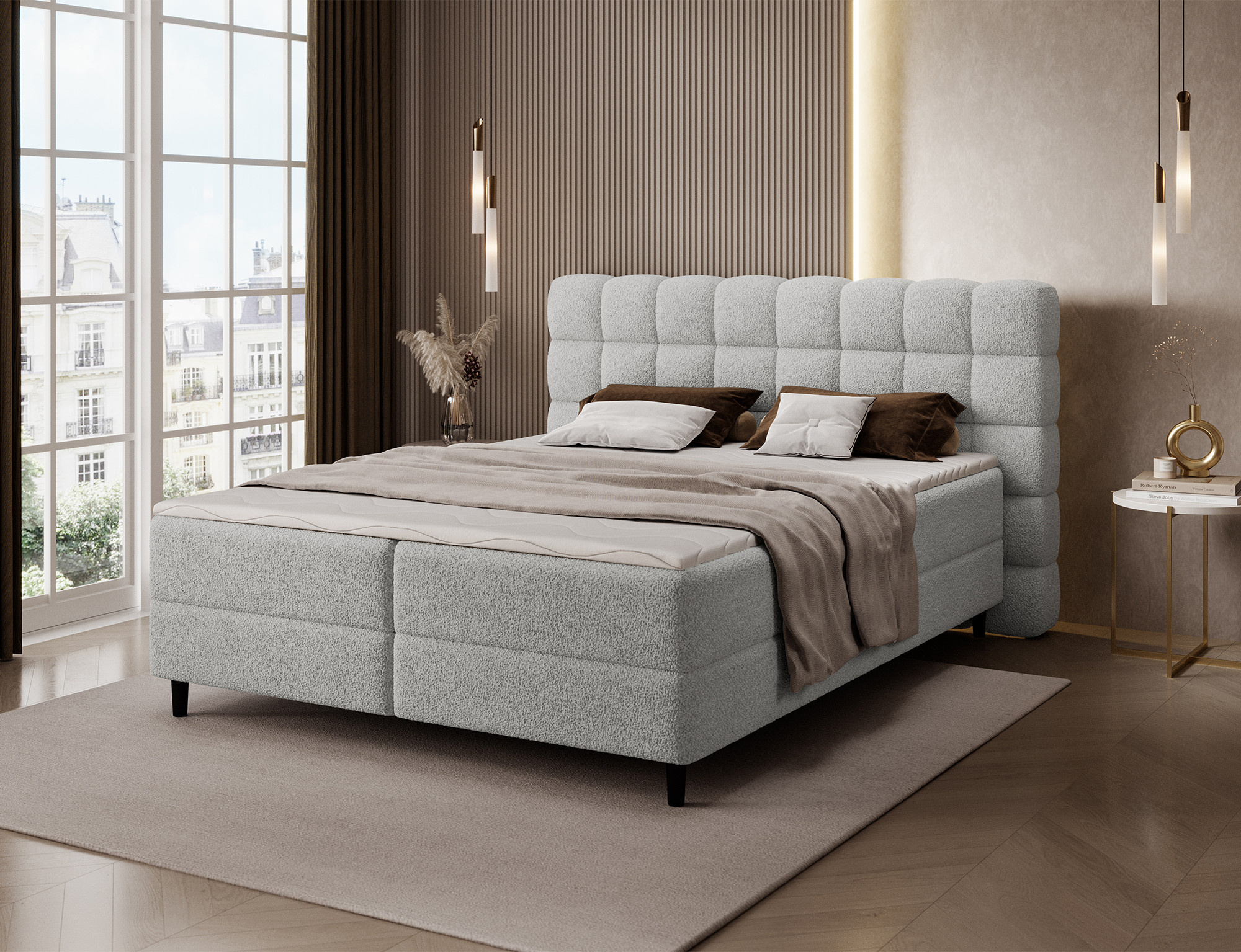 Kontinentální postel Camma kombinuje moderní design, funkčnost a vynikající spací komfort, což z ní činí ideální volbu pro elegantní a praktickou ložnici; je dostupná ve třech velikostech – 140x200 cm, 160x200 cm a 180x200 cm – a dokonale se přizpůsobí jak prostoru, tak individuálním potřebám, zatímco její pevná konstrukce s celkovou výškou 102 cm a výškou sedu 56 cm zajišťuje každodenní pohodlí; postel má hloubku 222 cm a šířka závisí na zvoleném modelu – 162 cm, 182 cm nebo 202 cm – což jí dodává stabilní a impozantní vzhled, který přidává luxusní nádech každému interiéru; čalouněná vysoce kvalitní látkou s jemným dotykem a stylově prošívaným čelem, kombinuje moderní eleganci s pohodlnou oporou pro čtení nebo relaxaci; praktický úložný box poskytuje prostor pro ložní prádlo a pomáhá udržovat ložnici uklizenou, což činí postel Camma nejen pohodlnou, ale také vysoce funkční; design je doplněn 10 cm černými dřevěnými nohami, které přidávají vizuální lehkost a usnadňují úklid pod postelí; model Camma je ideální volbou pro ty, kteří si cení moderního stylu, elegance, odolnosti a pohodlí, zajišťujícího zdravý a klidný spánek každou noc.