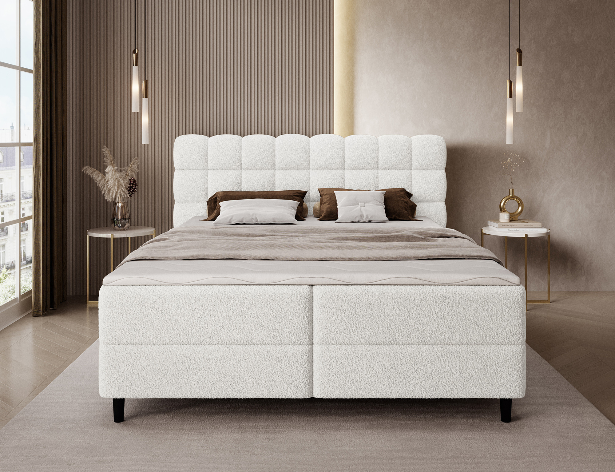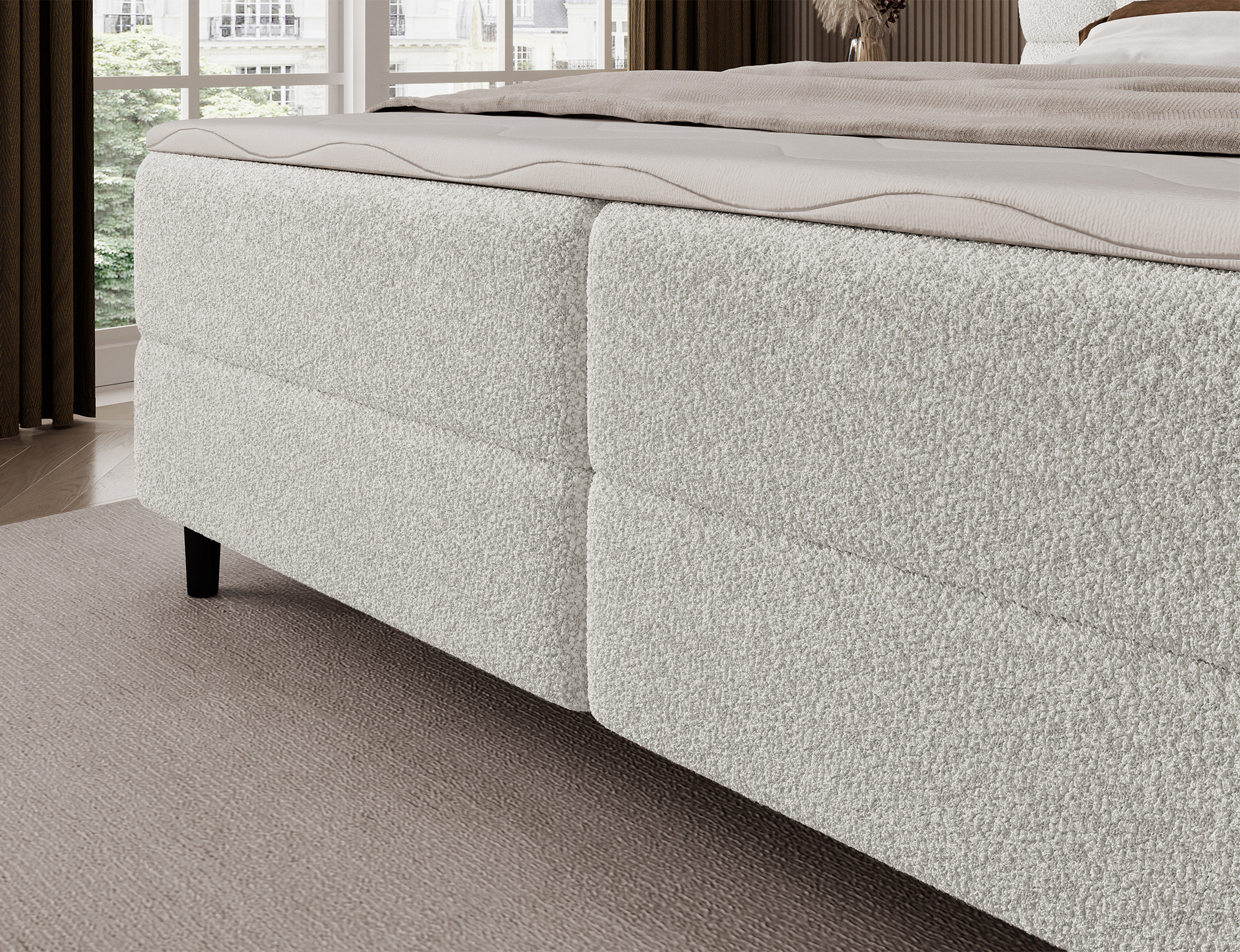 Kontinentální postel Camma kombinuje moderní design, funkčnost a vynikající spací komfort, což z ní činí ideální volbu pro elegantní a praktickou ložnici; je dostupná ve třech velikostech – 140x200 cm, 160x200 cm a 180x200 cm – a dokonale se přizpůsobí jak prostoru, tak individuálním potřebám, zatímco její pevná konstrukce s celkovou výškou 102 cm a výškou sedu 56 cm zajišťuje každodenní pohodlí; postel má hloubku 222 cm a šířka závisí na zvoleném modelu – 162 cm, 182 cm nebo 202 cm – což jí dodává stabilní a impozantní vzhled, který přidává luxusní nádech každému interiéru; čalouněná vysoce kvalitní látkou s jemným dotykem a stylově prošívaným čelem, kombinuje moderní eleganci s pohodlnou oporou pro čtení nebo relaxaci; praktický úložný box poskytuje prostor pro ložní prádlo a pomáhá udržovat ložnici uklizenou, což činí postel Camma nejen pohodlnou, ale také vysoce funkční; design je doplněn 10 cm černými dřevěnými nohami, které přidávají vizuální lehkost a usnadňují úklid pod postelí; model Camma je ideální volbou pro ty, kteří si cení moderního stylu, elegance, odolnosti a pohodlí, zajišťujícího zdravý a klidný spánek každou noc.