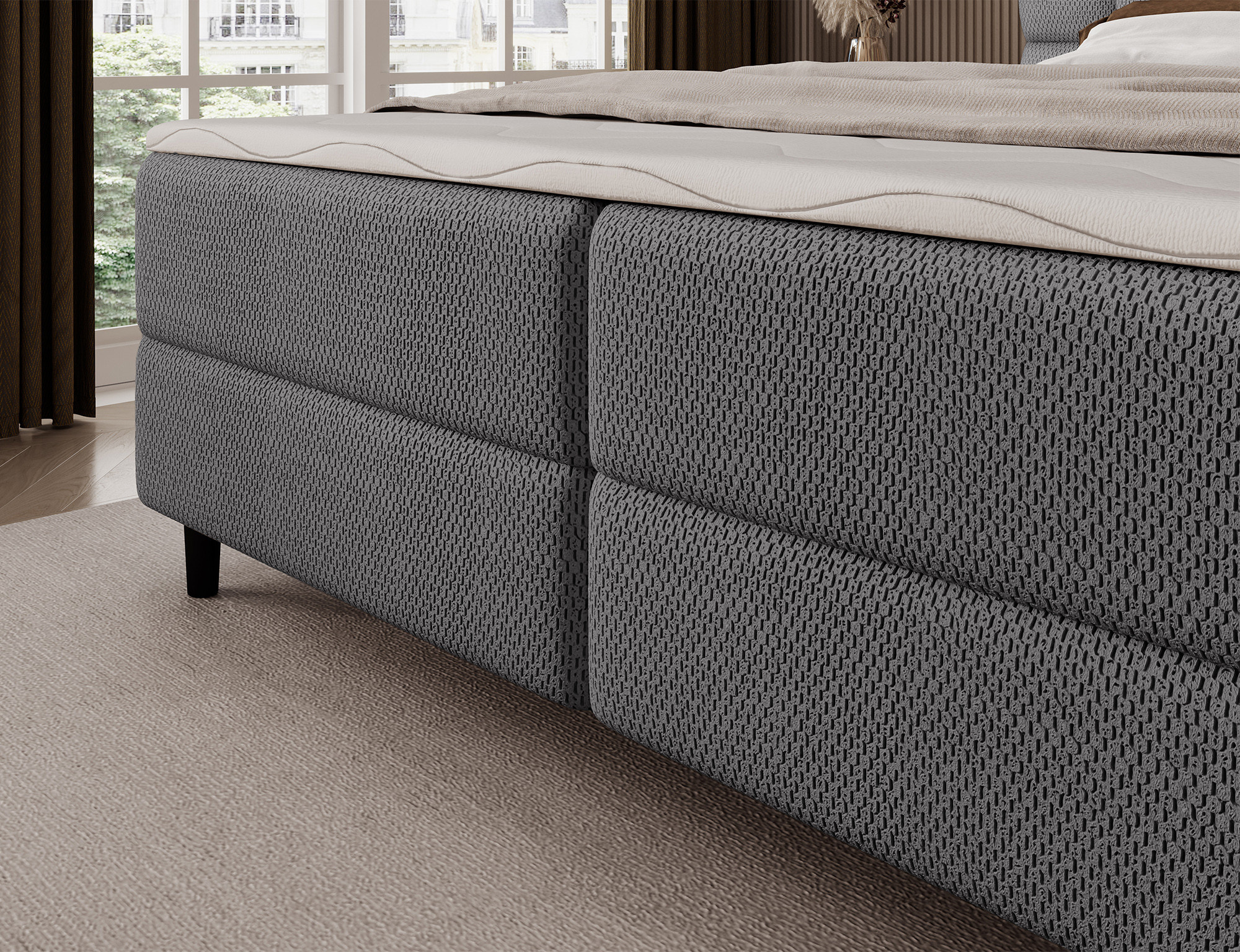 Kontinentální postel Camma kombinuje moderní design, funkčnost a vynikající spací komfort, což z ní činí ideální volbu pro elegantní a praktickou ložnici; je dostupná ve třech velikostech – 140x200 cm, 160x200 cm a 180x200 cm – a dokonale se přizpůsobí jak prostoru, tak individuálním potřebám, zatímco její pevná konstrukce s celkovou výškou 102 cm a výškou sedu 56 cm zajišťuje každodenní pohodlí; postel má hloubku 222 cm a šířka závisí na zvoleném modelu – 162 cm, 182 cm nebo 202 cm – což jí dodává stabilní a impozantní vzhled, který přidává luxusní nádech každému interiéru; čalouněná vysoce kvalitní látkou s jemným dotykem a stylově prošívaným čelem, kombinuje moderní eleganci s pohodlnou oporou pro čtení nebo relaxaci; praktický úložný box poskytuje prostor pro ložní prádlo a pomáhá udržovat ložnici uklizenou, což činí postel Camma nejen pohodlnou, ale také vysoce funkční; design je doplněn 10 cm černými dřevěnými nohami, které přidávají vizuální lehkost a usnadňují úklid pod postelí; model Camma je ideální volbou pro ty, kteří si cení moderního stylu, elegance, odolnosti a pohodlí, zajišťujícího zdravý a klidný spánek každou noc.