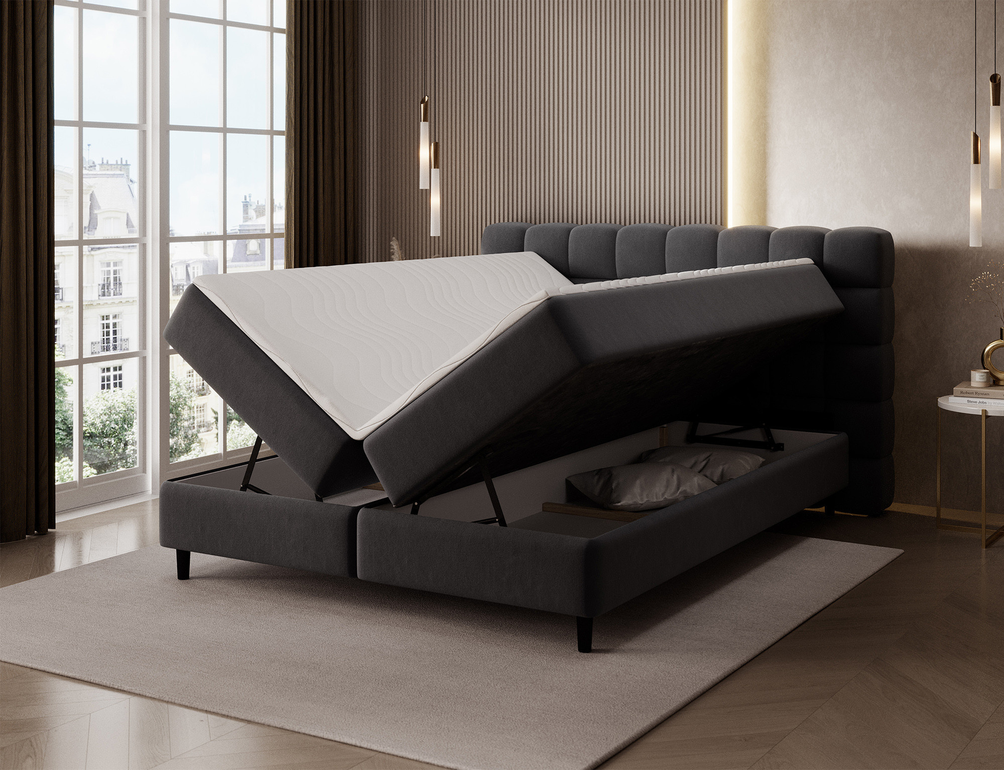 Kontinentální postel Camma kombinuje moderní design, funkčnost a vynikající spací komfort, což z ní činí ideální volbu pro elegantní a praktickou ložnici; je dostupná ve třech velikostech – 140x200 cm, 160x200 cm a 180x200 cm – a dokonale se přizpůsobí jak prostoru, tak individuálním potřebám, zatímco její pevná konstrukce s celkovou výškou 102 cm a výškou sedu 56 cm zajišťuje každodenní pohodlí; postel má hloubku 222 cm a šířka závisí na zvoleném modelu – 162 cm, 182 cm nebo 202 cm – což jí dodává stabilní a impozantní vzhled, který přidává luxusní nádech každému interiéru; čalouněná vysoce kvalitní látkou s jemným dotykem a stylově prošívaným čelem, kombinuje moderní eleganci s pohodlnou oporou pro čtení nebo relaxaci; praktický úložný box poskytuje prostor pro ložní prádlo a pomáhá udržovat ložnici uklizenou, což činí postel Camma nejen pohodlnou, ale také vysoce funkční; design je doplněn 10 cm černými dřevěnými nohami, které přidávají vizuální lehkost a usnadňují úklid pod postelí; model Camma je ideální volbou pro ty, kteří si cení moderního stylu, elegance, odolnosti a pohodlí, zajišťujícího zdravý a klidný spánek každou noc.