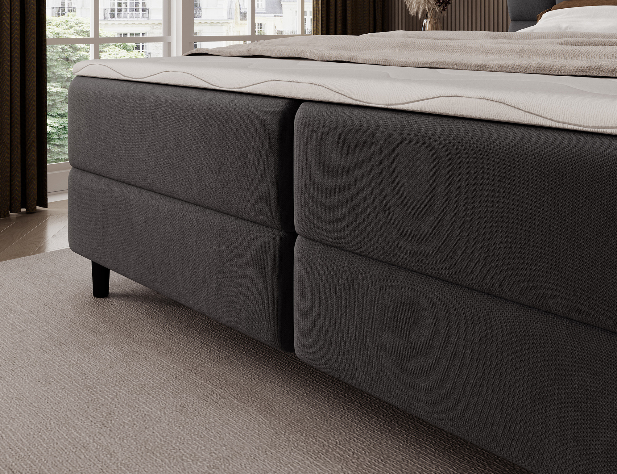 Kontinentální postel Camma kombinuje moderní design, funkčnost a vynikající spací komfort, což z ní činí ideální volbu pro elegantní a praktickou ložnici; je dostupná ve třech velikostech – 140x200 cm, 160x200 cm a 180x200 cm – a dokonale se přizpůsobí jak prostoru, tak individuálním potřebám, zatímco její pevná konstrukce s celkovou výškou 102 cm a výškou sedu 56 cm zajišťuje každodenní pohodlí; postel má hloubku 222 cm a šířka závisí na zvoleném modelu – 162 cm, 182 cm nebo 202 cm – což jí dodává stabilní a impozantní vzhled, který přidává luxusní nádech každému interiéru; čalouněná vysoce kvalitní látkou s jemným dotykem a stylově prošívaným čelem, kombinuje moderní eleganci s pohodlnou oporou pro čtení nebo relaxaci; praktický úložný box poskytuje prostor pro ložní prádlo a pomáhá udržovat ložnici uklizenou, což činí postel Camma nejen pohodlnou, ale také vysoce funkční; design je doplněn 10 cm černými dřevěnými nohami, které přidávají vizuální lehkost a usnadňují úklid pod postelí; model Camma je ideální volbou pro ty, kteří si cení moderního stylu, elegance, odolnosti a pohodlí, zajišťujícího zdravý a klidný spánek každou noc.