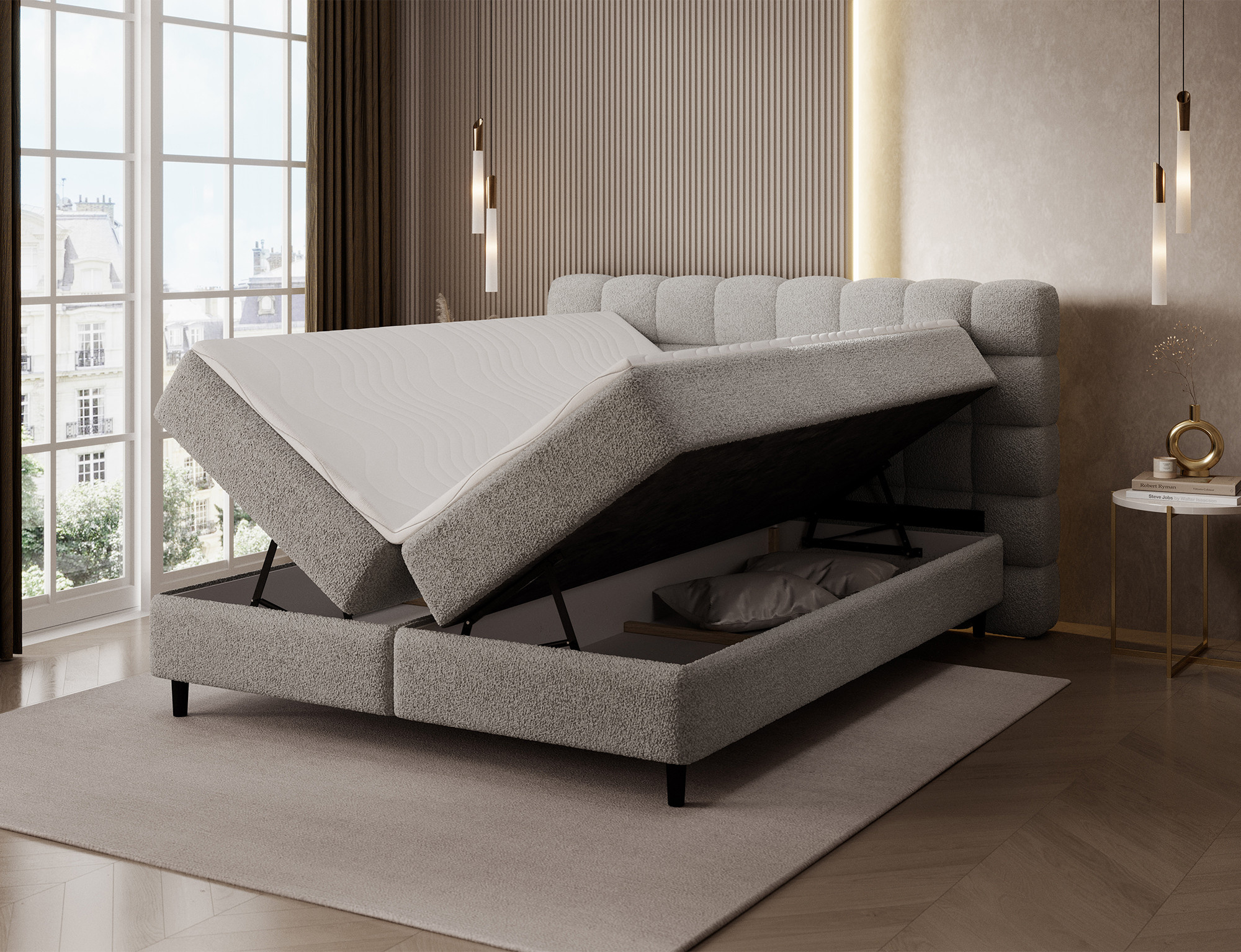 Kontinentální postel Camma kombinuje moderní design, funkčnost a vynikající spací komfort, což z ní činí ideální volbu pro elegantní a praktickou ložnici; je dostupná ve třech velikostech – 140x200 cm, 160x200 cm a 180x200 cm – a dokonale se přizpůsobí jak prostoru, tak individuálním potřebám, zatímco její pevná konstrukce s celkovou výškou 102 cm a výškou sedu 56 cm zajišťuje každodenní pohodlí; postel má hloubku 222 cm a šířka závisí na zvoleném modelu – 162 cm, 182 cm nebo 202 cm – což jí dodává stabilní a impozantní vzhled, který přidává luxusní nádech každému interiéru; čalouněná vysoce kvalitní látkou s jemným dotykem a stylově prošívaným čelem, kombinuje moderní eleganci s pohodlnou oporou pro čtení nebo relaxaci; praktický úložný box poskytuje prostor pro ložní prádlo a pomáhá udržovat ložnici uklizenou, což činí postel Camma nejen pohodlnou, ale také vysoce funkční; design je doplněn 10 cm černými dřevěnými nohami, které přidávají vizuální lehkost a usnadňují úklid pod postelí; model Camma je ideální volbou pro ty, kteří si cení moderního stylu, elegance, odolnosti a pohodlí, zajišťujícího zdravý a klidný spánek každou noc.