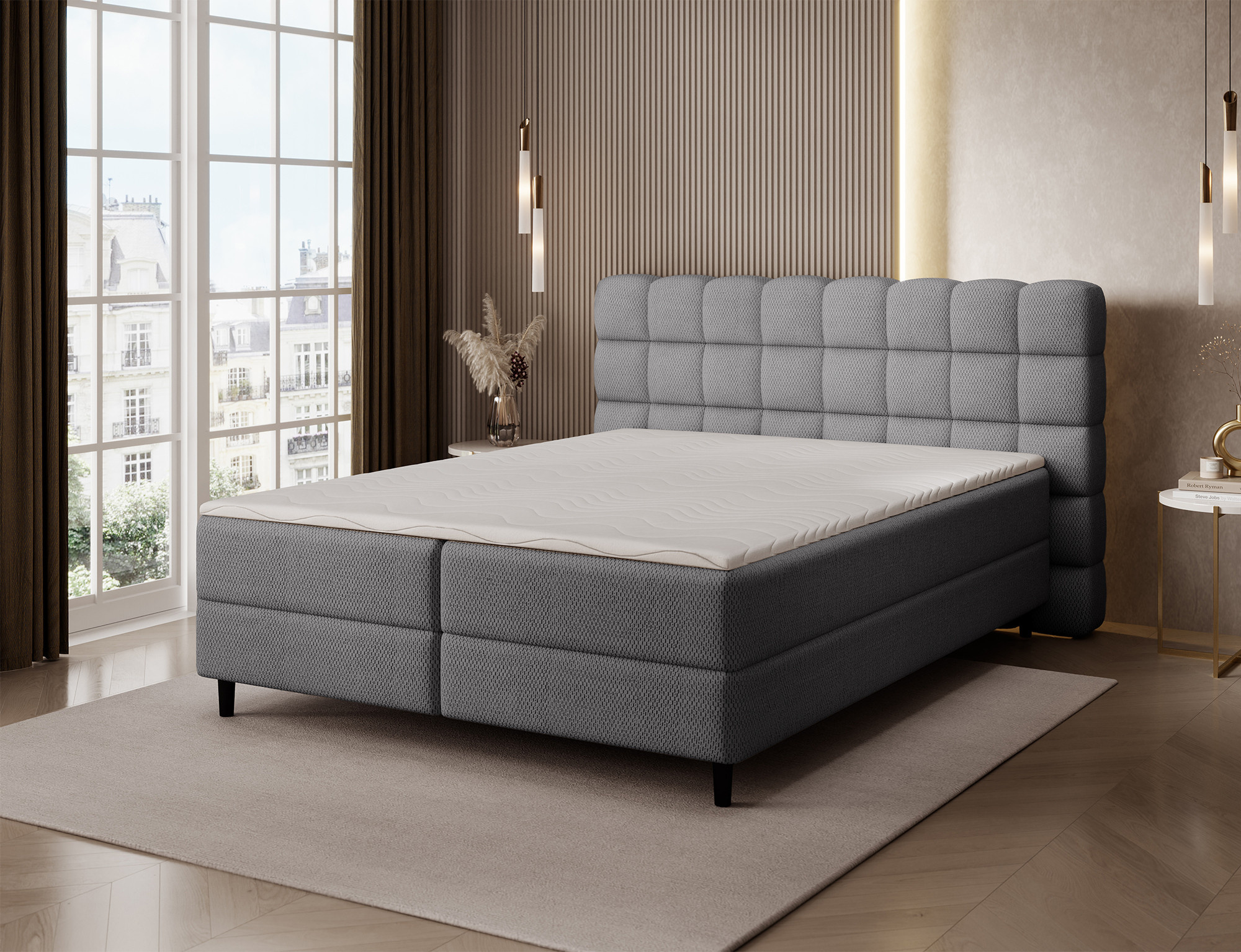 Kontinentální postel Camma kombinuje moderní design, funkčnost a vynikající spací komfort, což z ní činí ideální volbu pro elegantní a praktickou ložnici; je dostupná ve třech velikostech – 140x200 cm, 160x200 cm a 180x200 cm – a dokonale se přizpůsobí jak prostoru, tak individuálním potřebám, zatímco její pevná konstrukce s celkovou výškou 102 cm a výškou sedu 56 cm zajišťuje každodenní pohodlí; postel má hloubku 222 cm a šířka závisí na zvoleném modelu – 162 cm, 182 cm nebo 202 cm – což jí dodává stabilní a impozantní vzhled, který přidává luxusní nádech každému interiéru; čalouněná vysoce kvalitní látkou s jemným dotykem a stylově prošívaným čelem, kombinuje moderní eleganci s pohodlnou oporou pro čtení nebo relaxaci; praktický úložný box poskytuje prostor pro ložní prádlo a pomáhá udržovat ložnici uklizenou, což činí postel Camma nejen pohodlnou, ale také vysoce funkční; design je doplněn 10 cm černými dřevěnými nohami, které přidávají vizuální lehkost a usnadňují úklid pod postelí; model Camma je ideální volbou pro ty, kteří si cení moderního stylu, elegance, odolnosti a pohodlí, zajišťujícího zdravý a klidný spánek každou noc.