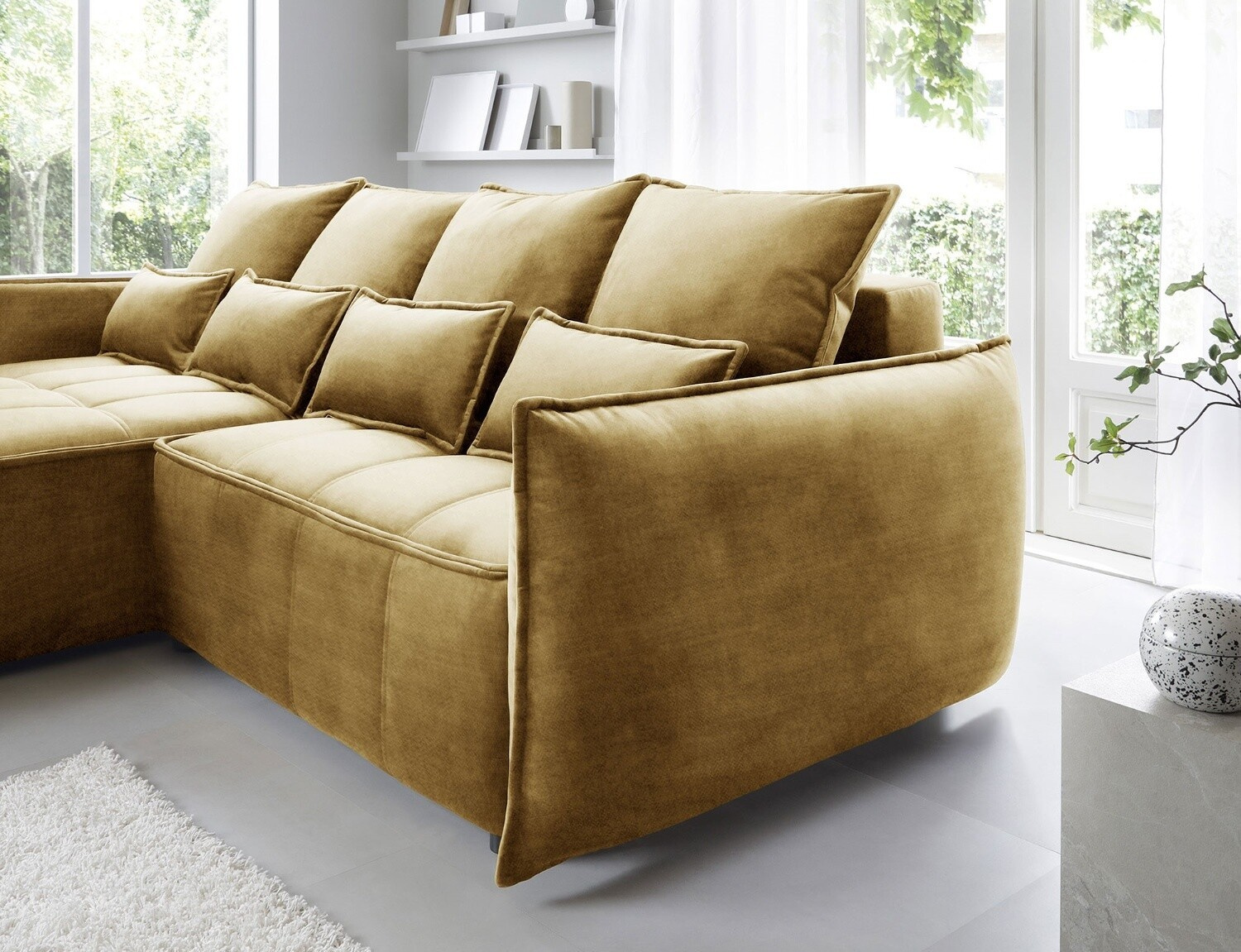 Rohová pohovka Campo, měřící 265x196x88 cm, je elegantní a funkční kus nábytku s úložným prostorem na ložní prádlo (97x60x15 cm). Vybaveno 4 polštáři na opěradlo a 4 bederními polštáři, poskytuje pohodlí a oporu pro záda. Produkt je dostupný pouze ve vybraných látkách z kolekce ELTAP. Rohová pohovka Campo je vynikající volbou pro ty, kteří si cení pohodlí, funkčnosti a elegantního designu. Díky svému promyšlenému designu a dalším polštářům nabízí pohodlné místo k odpočinku a úložný prostor pomáhá udržovat věci uspořádané. Možnost výběru z vybraných látek umožňuje vytvořit kus nábytku, který dokonale doplňuje zbytek interiéru.
