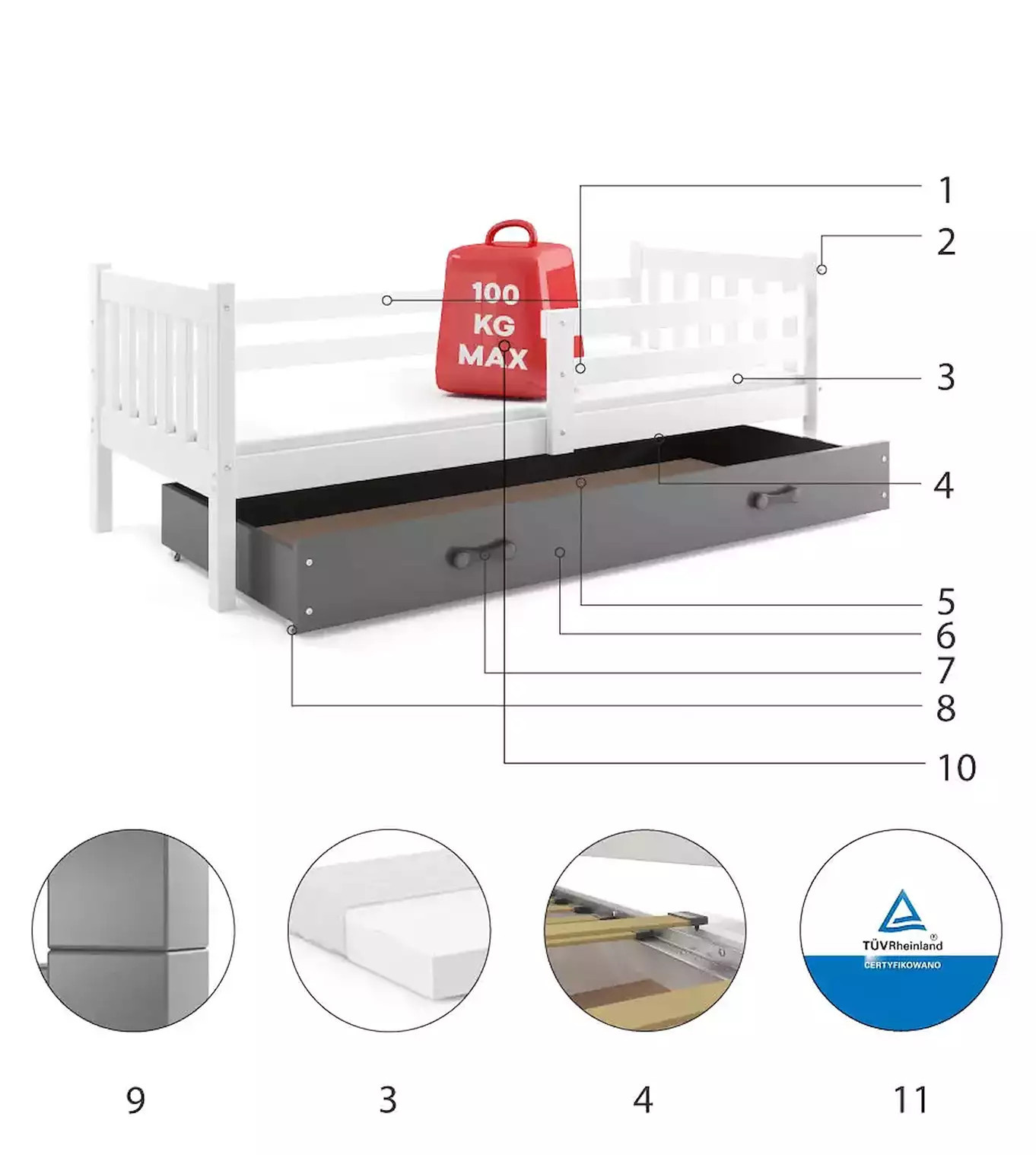 Dětská postel CARINO 90x200 cm se šuplíkem, bez matrace, Bílá/Grafit