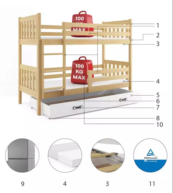 - Certyfikowane łóżko - jakość i bezpieczeństwo zgodnie z normami TUV.