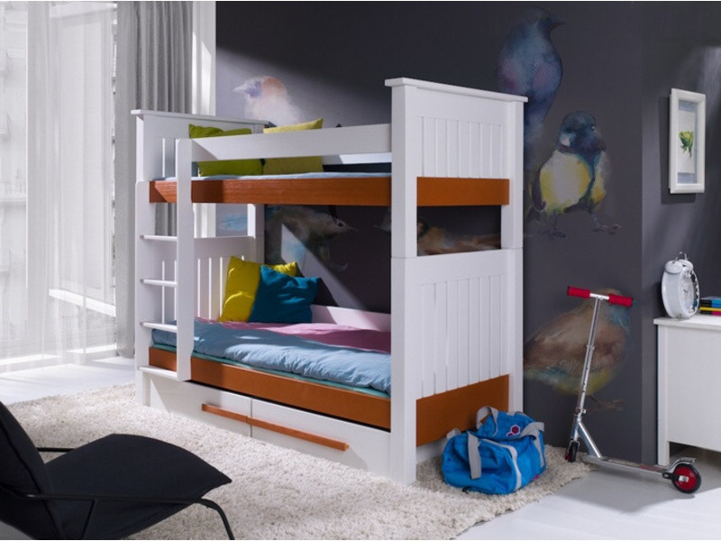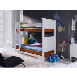 CASIMIR je dětská patrová postel z lakovaného borovicového dřeva (pouze konstrukce postele), barevné doplňky jsou z materiálu PVC. Hrany postele jsou kryty lištami ABS. V ceně postele jsou také 2 úložné šuplíky. Maximální nosnost horní postele je 80 kg, spodní postele pak 120 kg.