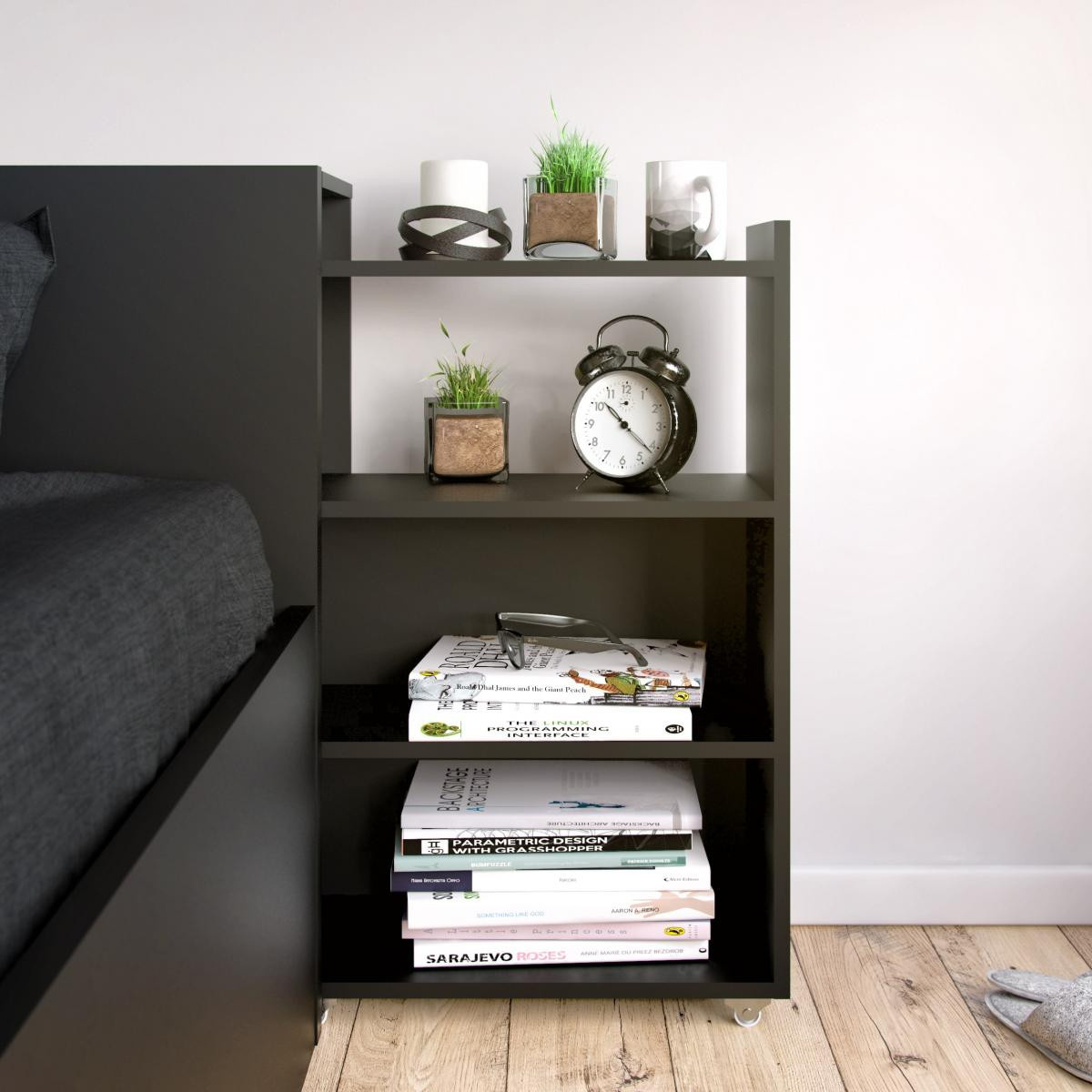 Čelo postele s posuvnými regály síře 140 cm, je skvělým doplňkem k posteli Simplicity 140x200 cm. Se svým skrytým úložným prostorem na knihy, časopisy a všechny další věci, které byste rádi měli po ruce, se stane velmi praktickým a využívaným kusem nábytku. Když jsou regály vysunuté a nahradí Vám noční stolek. Jakmile je zasunete, bude Vaše ložnice stále působit uspořádaně. Pro snadné posunování jsou regály vybaveny kolečky. Čelo je dodáváno v demontu a součástí balení je montážní plánek včetně všech potřebných spojovacích prvků. Vyobrazené dekorace nejsou v ceně.