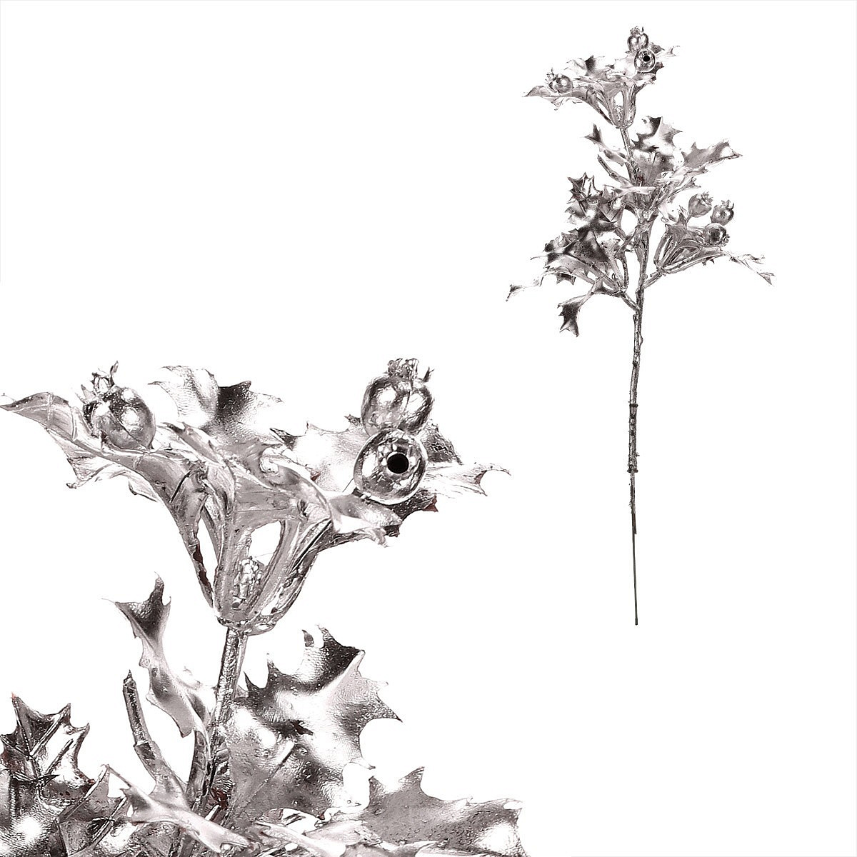 Umělá větev cesmíny ve stříbrném provedení je skvělým doplňkem pro vánoční výzdobu. Její lesklé lístky a drobné plody dodají aranžím slavnostní nádech a vytvoří elegantní kontrast k zeleným či červeným dekoracím. Vhodná pro zdobení stolů, věnců i svátečních kytic.