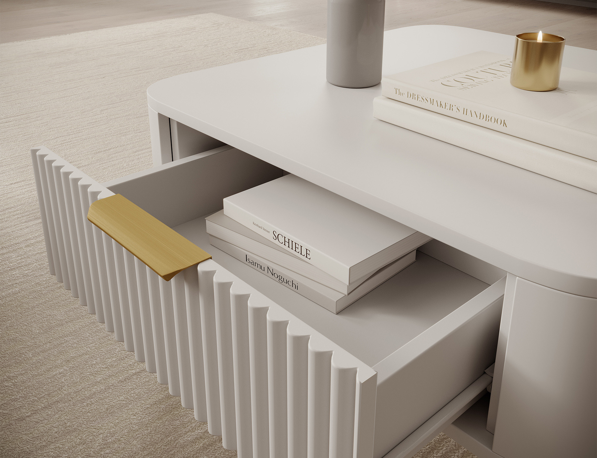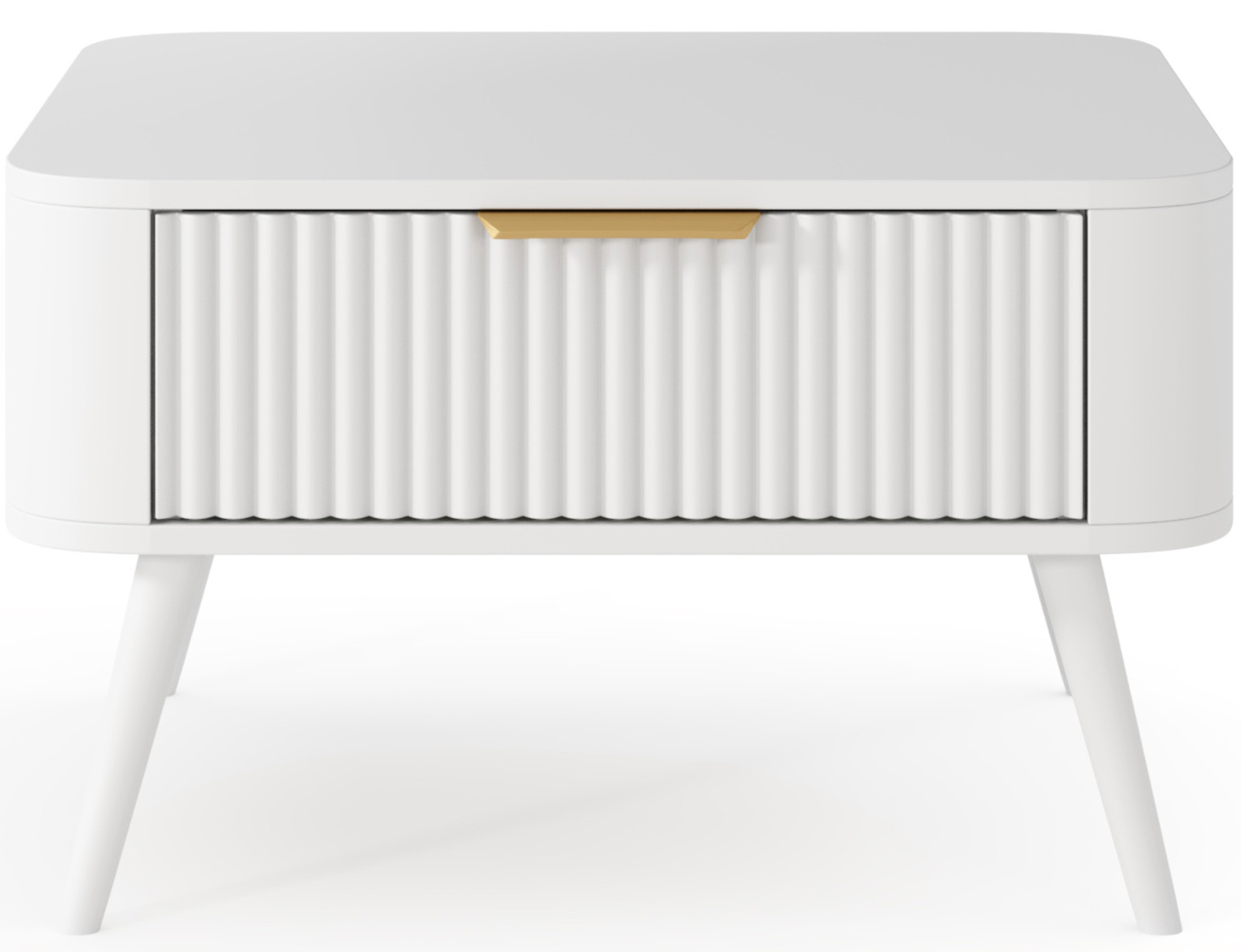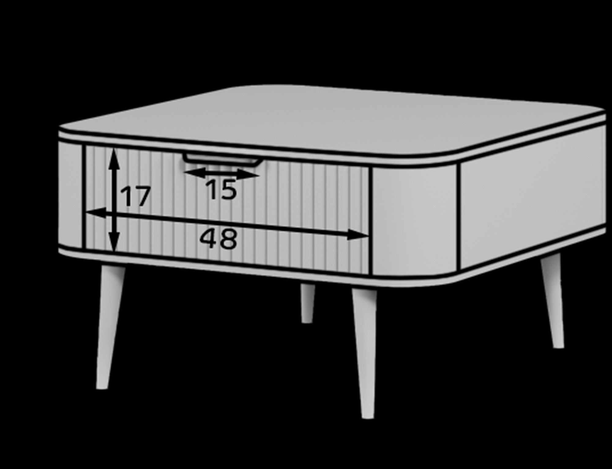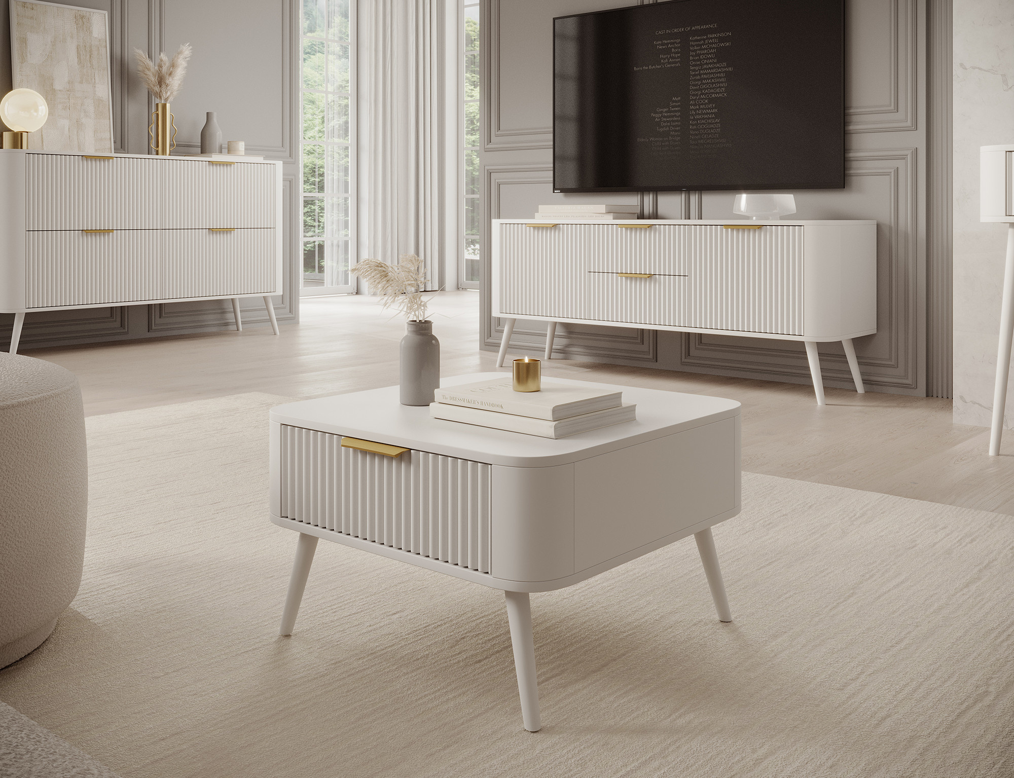 Konferenční stolek Chavelle (67x40x67 cm) je moderní kus, který kombinuje eleganci s funkčností a dokonale doplňuje moderní uspořádání obývacího pokoje. Přední část stolu je vyrobena z odolného MDF s esteticky příjemným ABS okrajem a žebrovaným povrchem, který dodává kusu jedinečný charakter. Laminované dřevotřískové tělo zajišťuje odolnost a rezistenci vůči každodennímu používání. Stůl obsahuje jednu praktickou zásuvku na kolejnici, která umožňuje plynulé a tiché otevírání. 20 cm vysoké bílé dřevěné nohy dodávají pocit lehkosti a moderní vzhled, zatímco zlatá kovová rukojeť přidává rafinovaný stylistický akcent. Konferenční stolek Chavelle je vynikající volbou pro ty, kteří ocení sofistikovaný design a uživatelský komfort ve stylových interiérech.